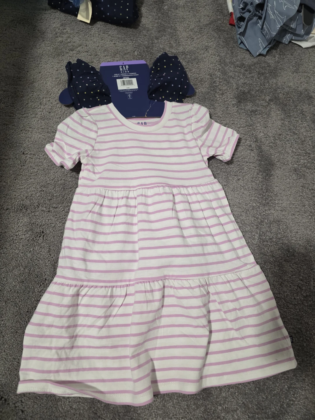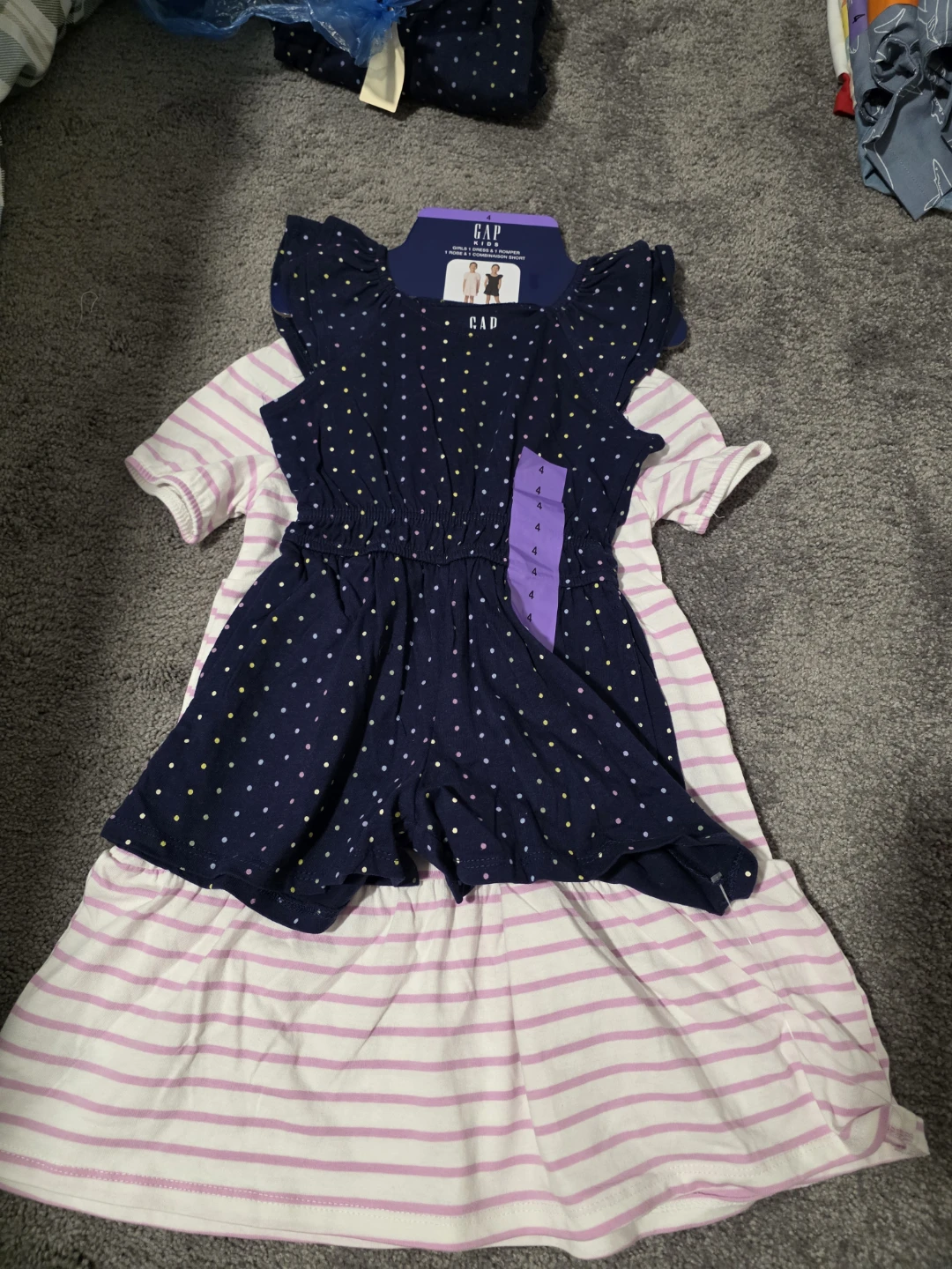 This is a GAP Kids girls' set. It includes one dress and one romper. The dress is navy with colourful polka dots. Size is 7& 4