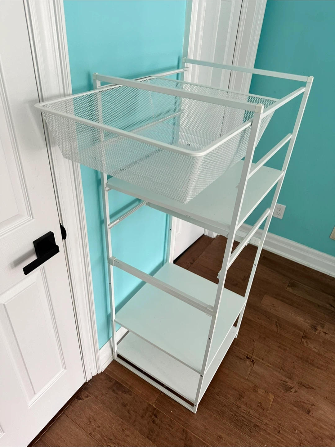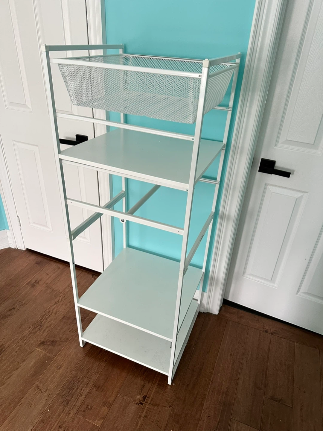 White metal shelving unit with four shelves and a top basket. This unit's open design makes it versatile for storage. Perfect for organizing items in a closet or small space.
