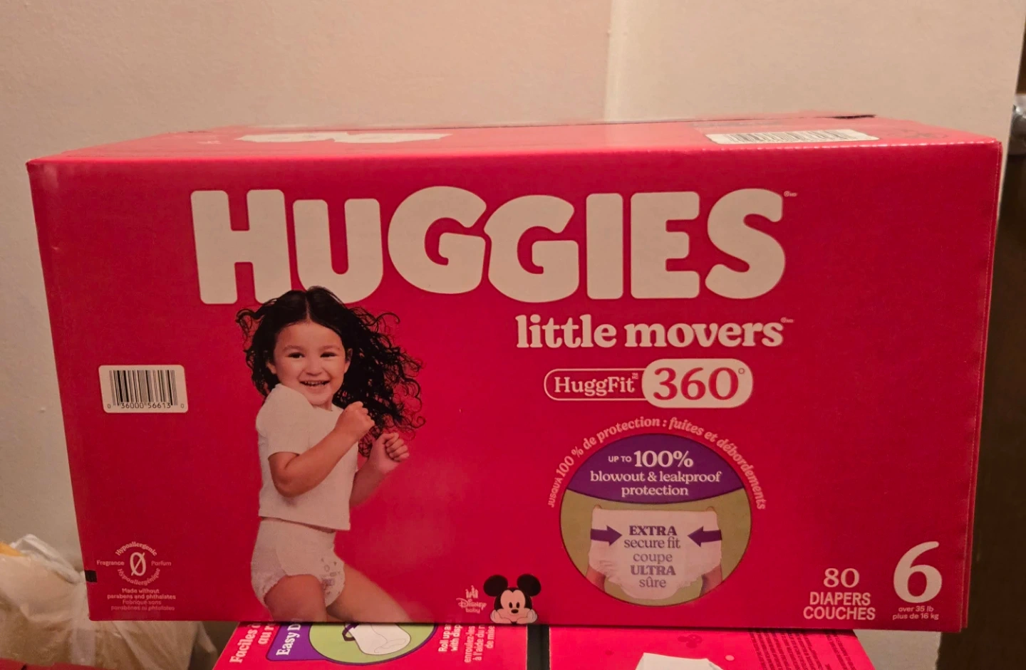 Huggies Little Movers diapers feature HuggFit 360 for up to 100% blowout and leakproof protection. They're made without parabens and phthalates. This box contains 80 diapers, suitable for babies over 35 lbs.