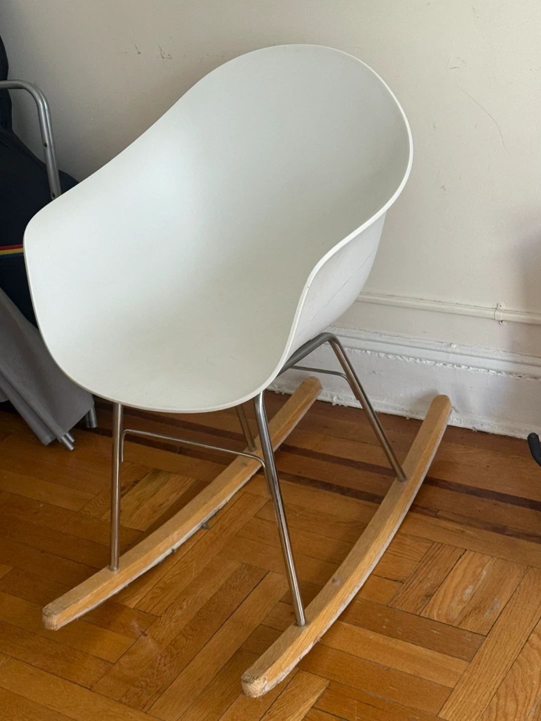 This rocking chair features a molded white seat and sleek metal legs. It's supported by natural wood runners for a classic rocking motion. Sturdy construction for relaxing moments.