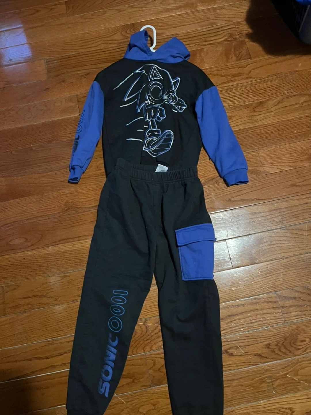 Comfy black and blue Sonic the Hedgehog tracksuit for kids. Features Sonic graphic on the hoodie and "SONIC 0001" text on the pants. Includes a contrast blue pocket on the pants. Also a grey Nike pants and flash sweater size 7 boys