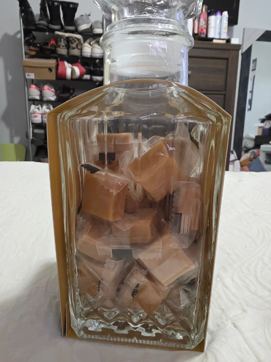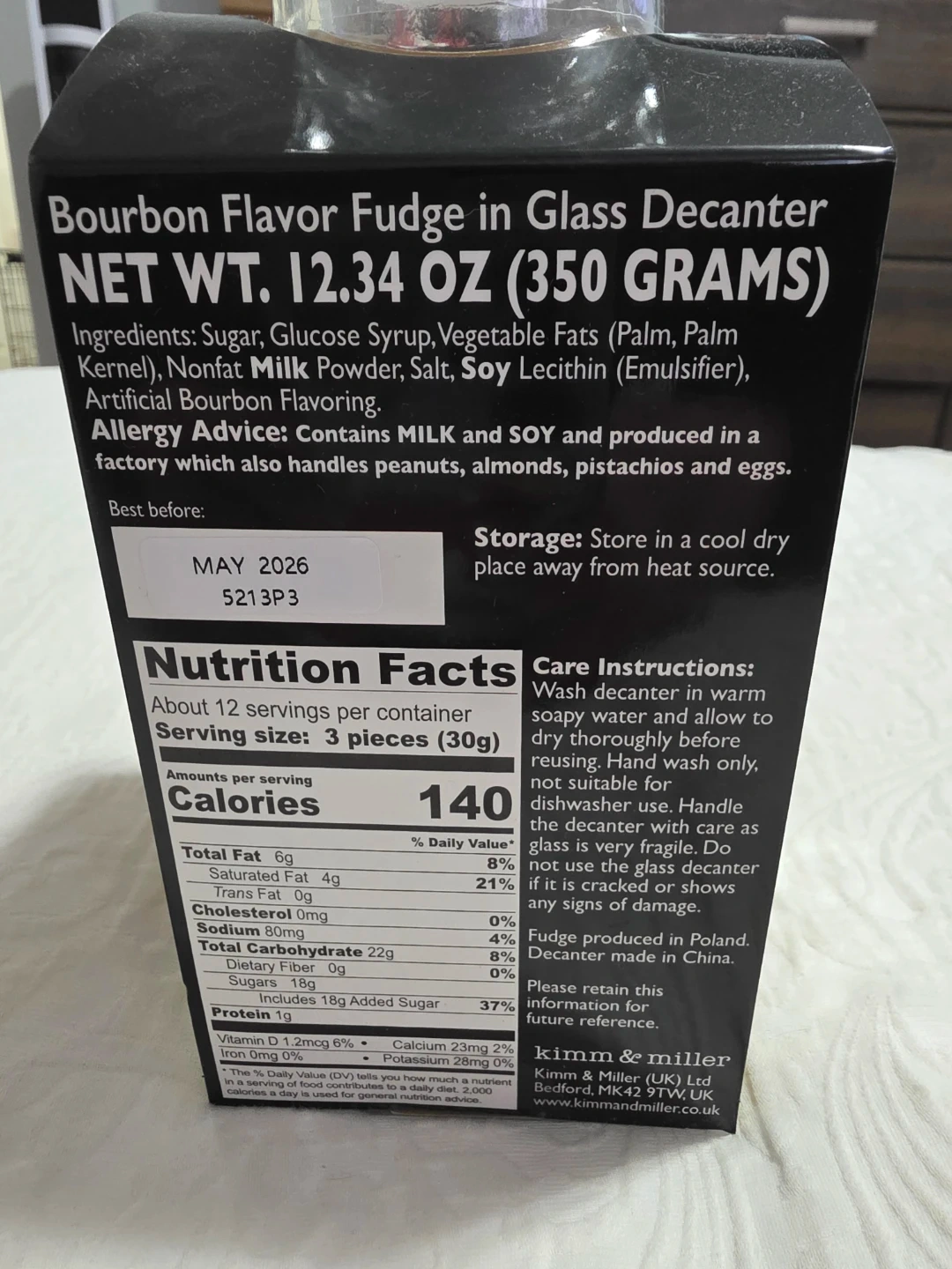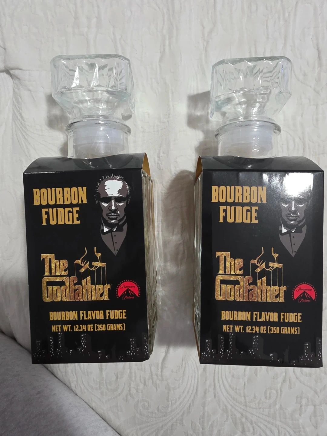 Set of two Godfather themed glass decanters filled with bourbon flavor fudge. Each decanter contains 12.34 oz (350 grams) of fudge. Best before May 2026. Fudge produced in Poland. Decanter made in China.