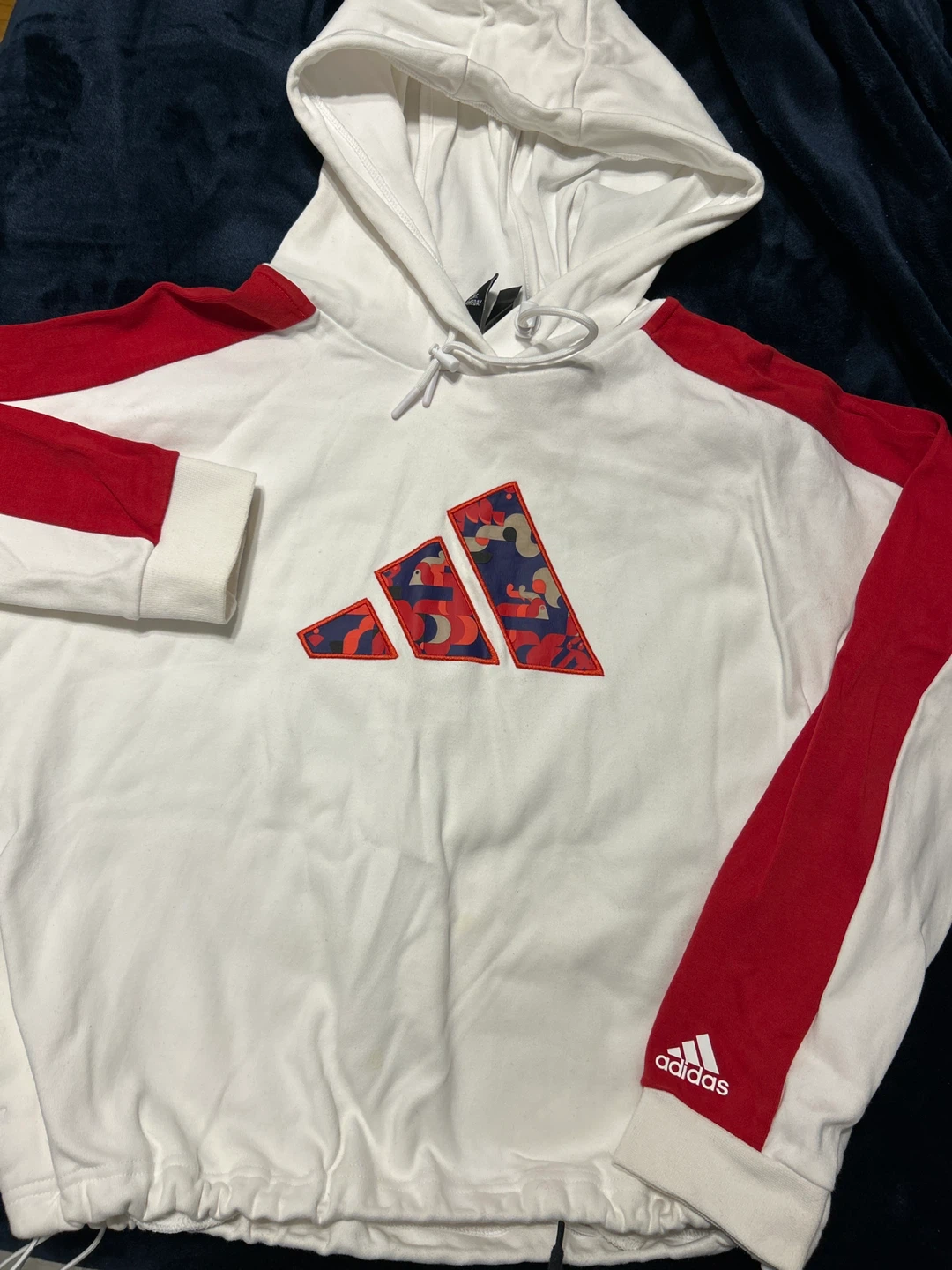 Here's an Adidas hoodie in a size medium/medium! It features a unique design on the iconic Adidas logo and red stripes on the sleeves. A stylish and comfy addition to any wardrobe! Not my size