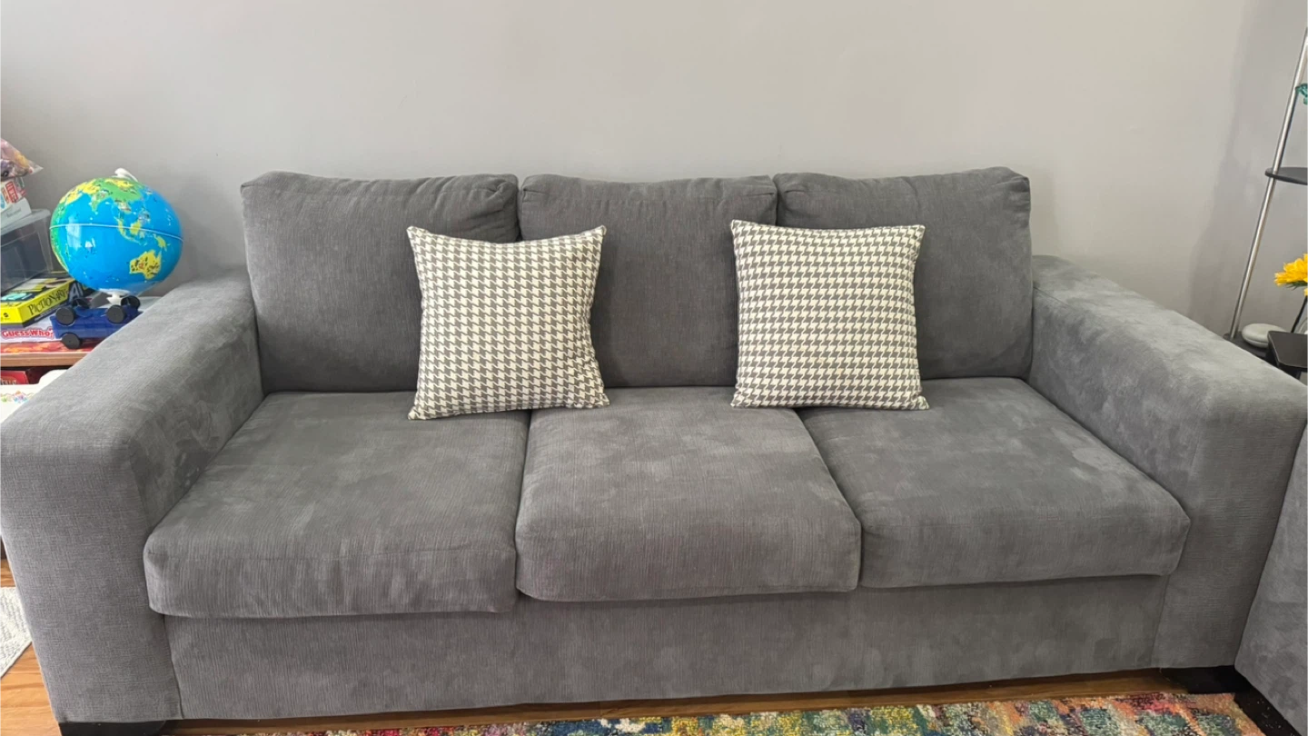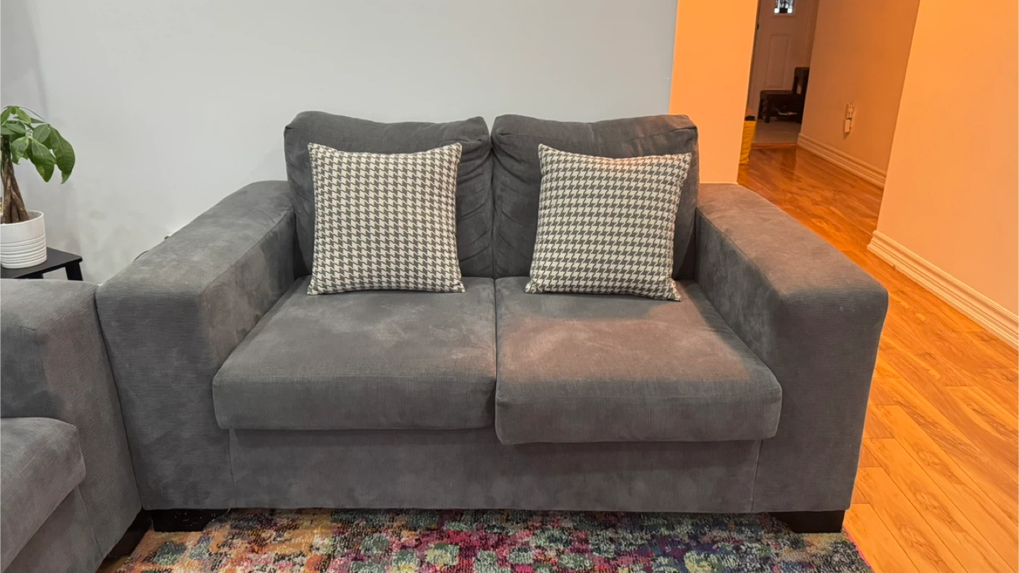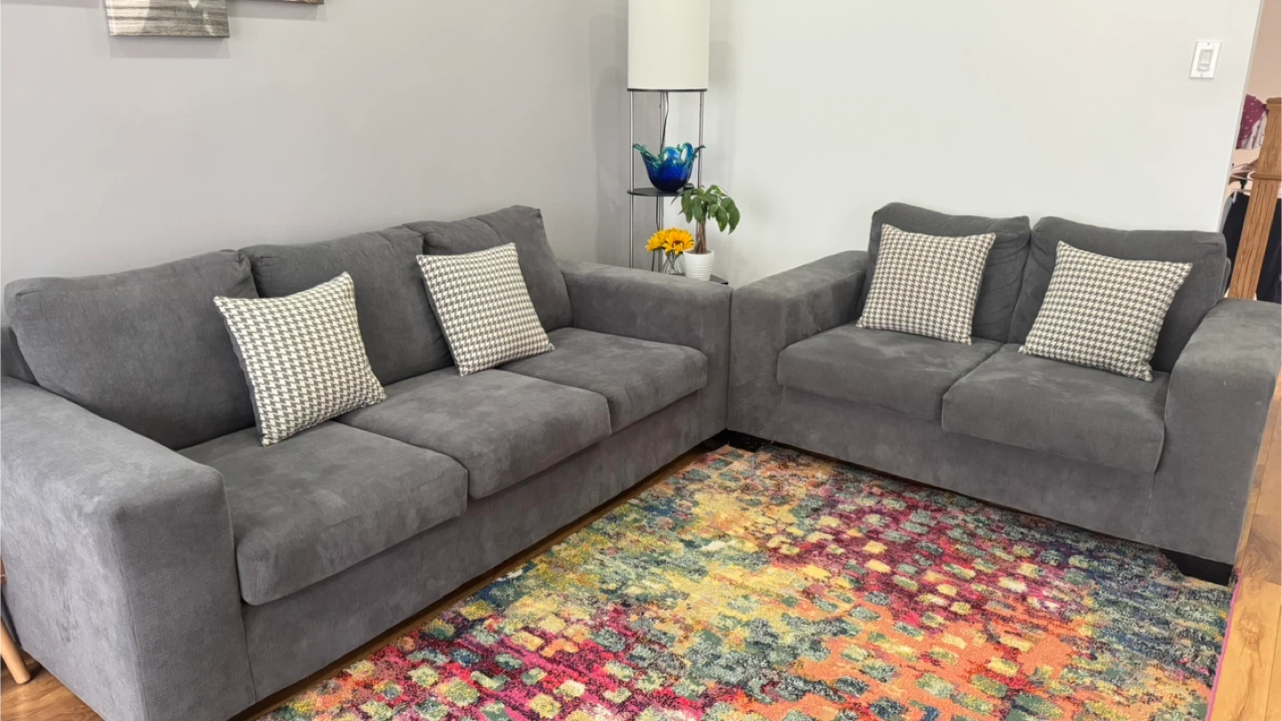 Both pieces are in great shape. The soft chenille-textured fabric has held up well, cushions are still plump and supportive. A complete living room seating setup ready to move in.