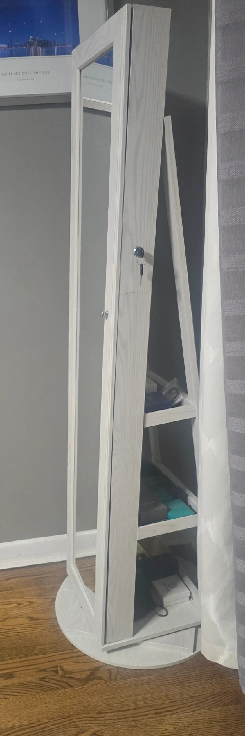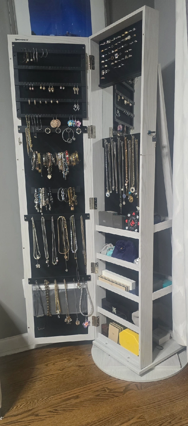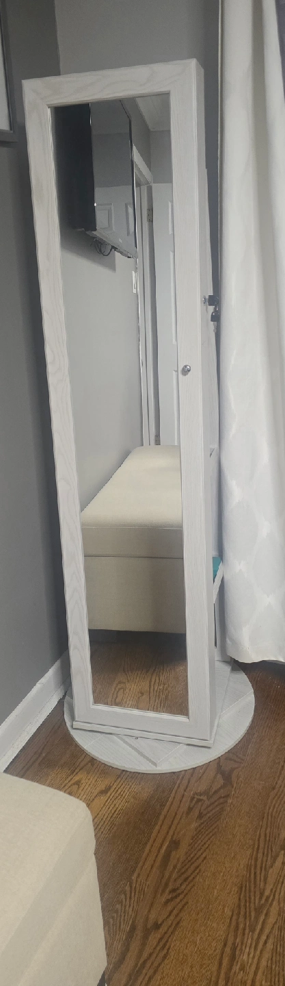 53Sealed in box, never opened. pics are of mine to show the product 360 rotating jewelry armoire cabinet. Full length mirror with lockable cabinet. Brand new in sealed box. Retails $220 plus tax.