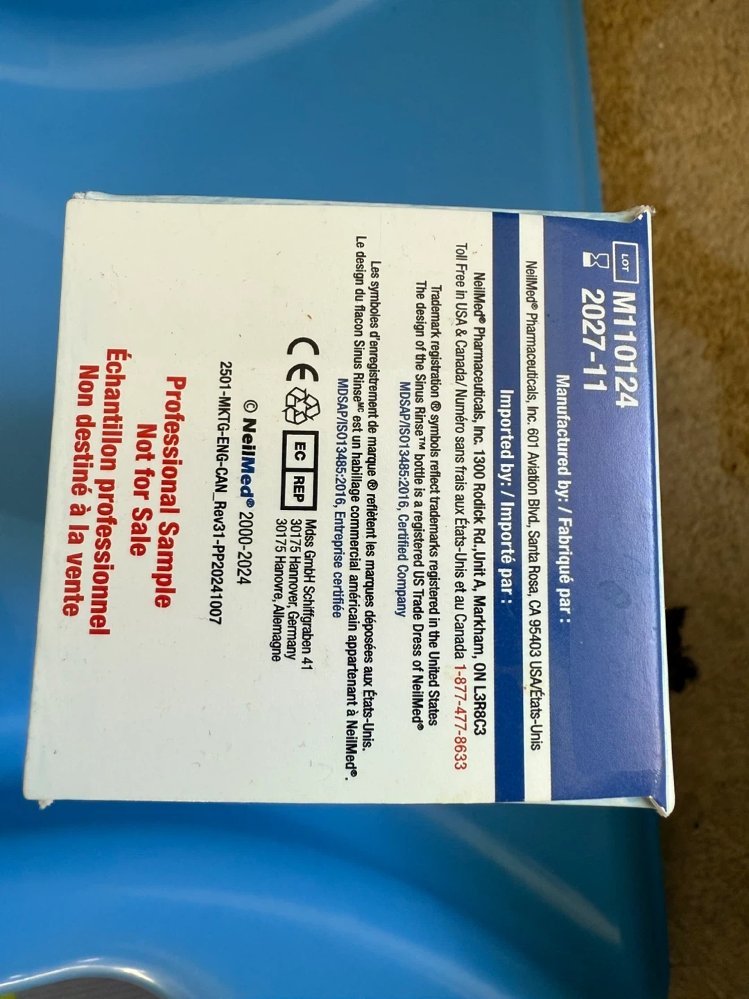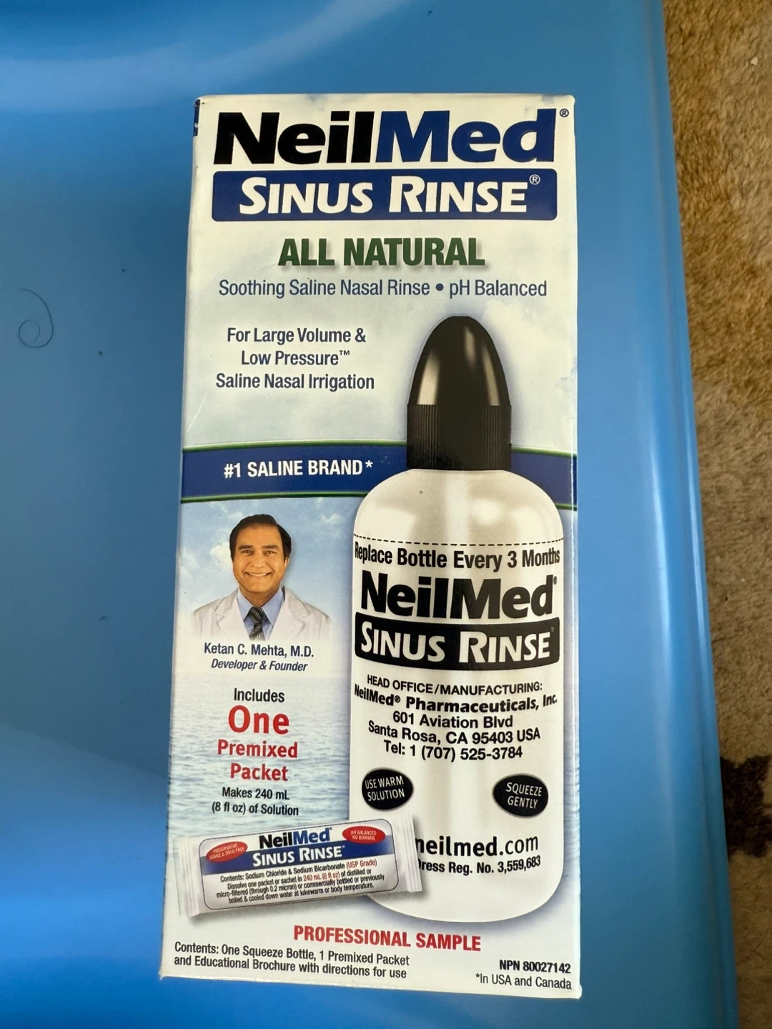 NeilMed Sinus Rinse kit, all natural for soothing saline nasal rinse and pH balanced. It's designed for large volume and low pressure saline nasal irrigation. The box includes one premixed packet. The box indicates a manufacturing date of 2027 November 11.