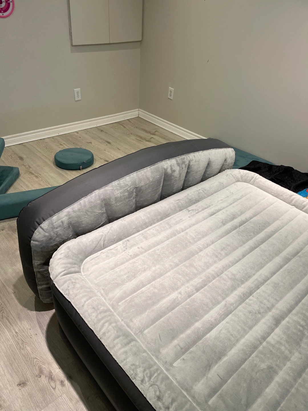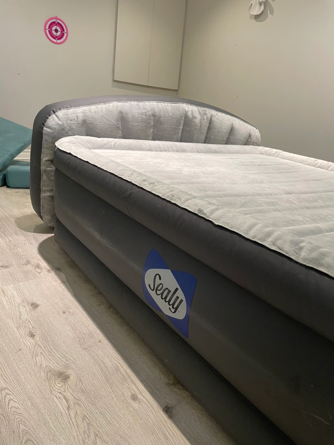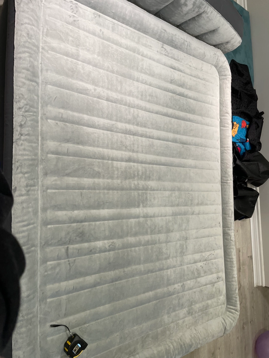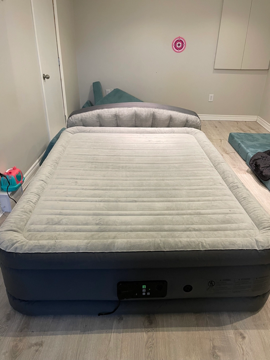 12Queen-size inflatable mattress with built-in headboard. Grey flocked top. Electric pump included. Used condition.