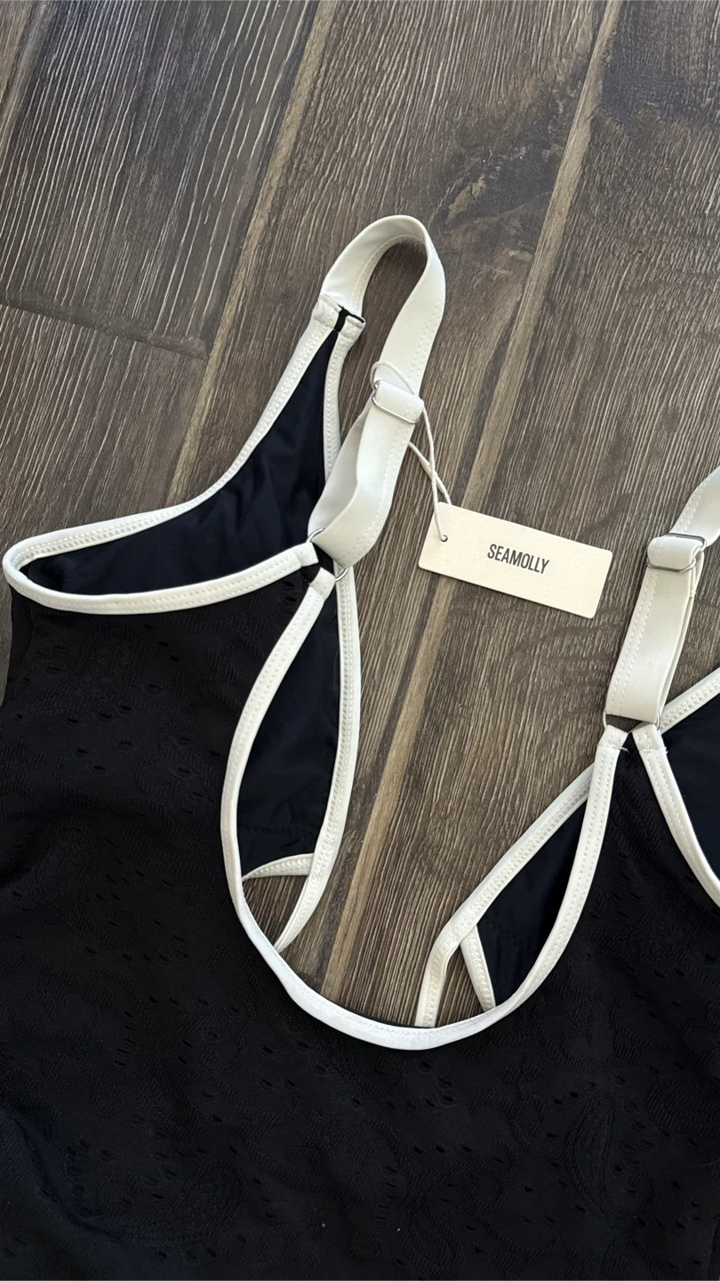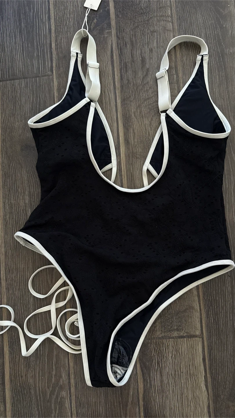 45Selling a brand new SEAMOLLY Vintage Lace Jacquard Contrast Color Monokini One-Piece Swimsuit! It's a beautiful black swimsuit with white contrast detailing. I bought this for $63.16 CAD