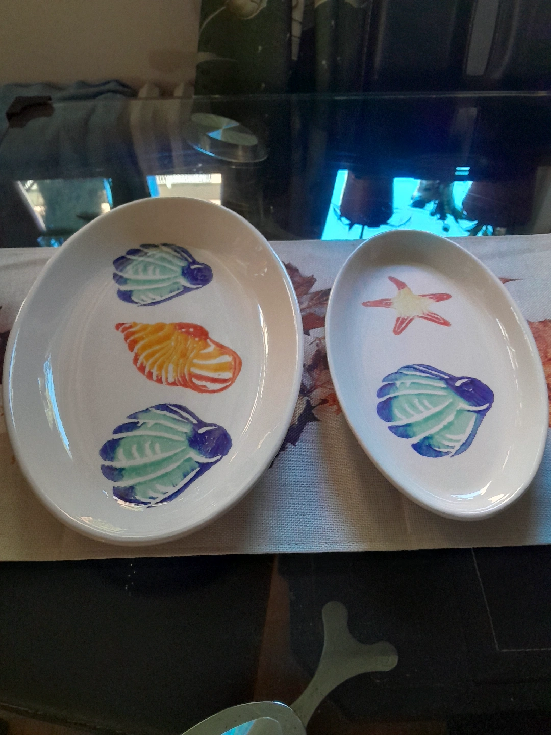 Selling two decorative plates with cute seashell and starfish designs! They're perfect for adding a touch of seaside charm to your home. They're in great condition and ready for a new home. Big one is 14" in length & small one is 12" in length