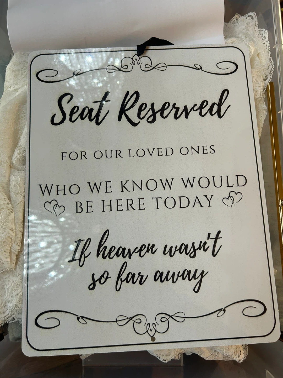 Selling a 'Seat Reserved' sign for weddings or special events. It's a lovely way to honour loved ones. The sign reads: 'Seat Reserved for our loved ones who we know would be here today. If heaven wasn't so far away' $25 cash only. Pick up Beaumont