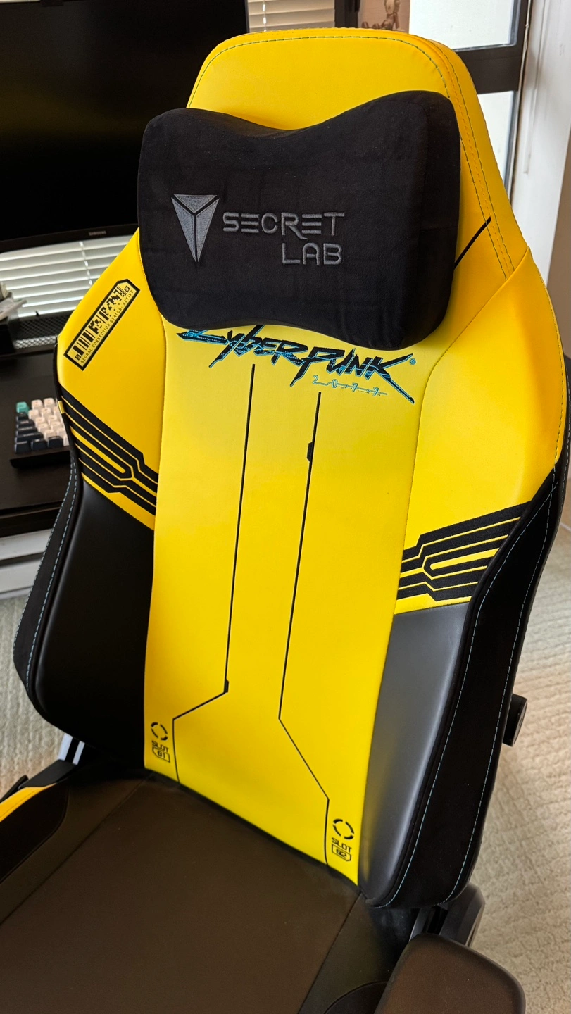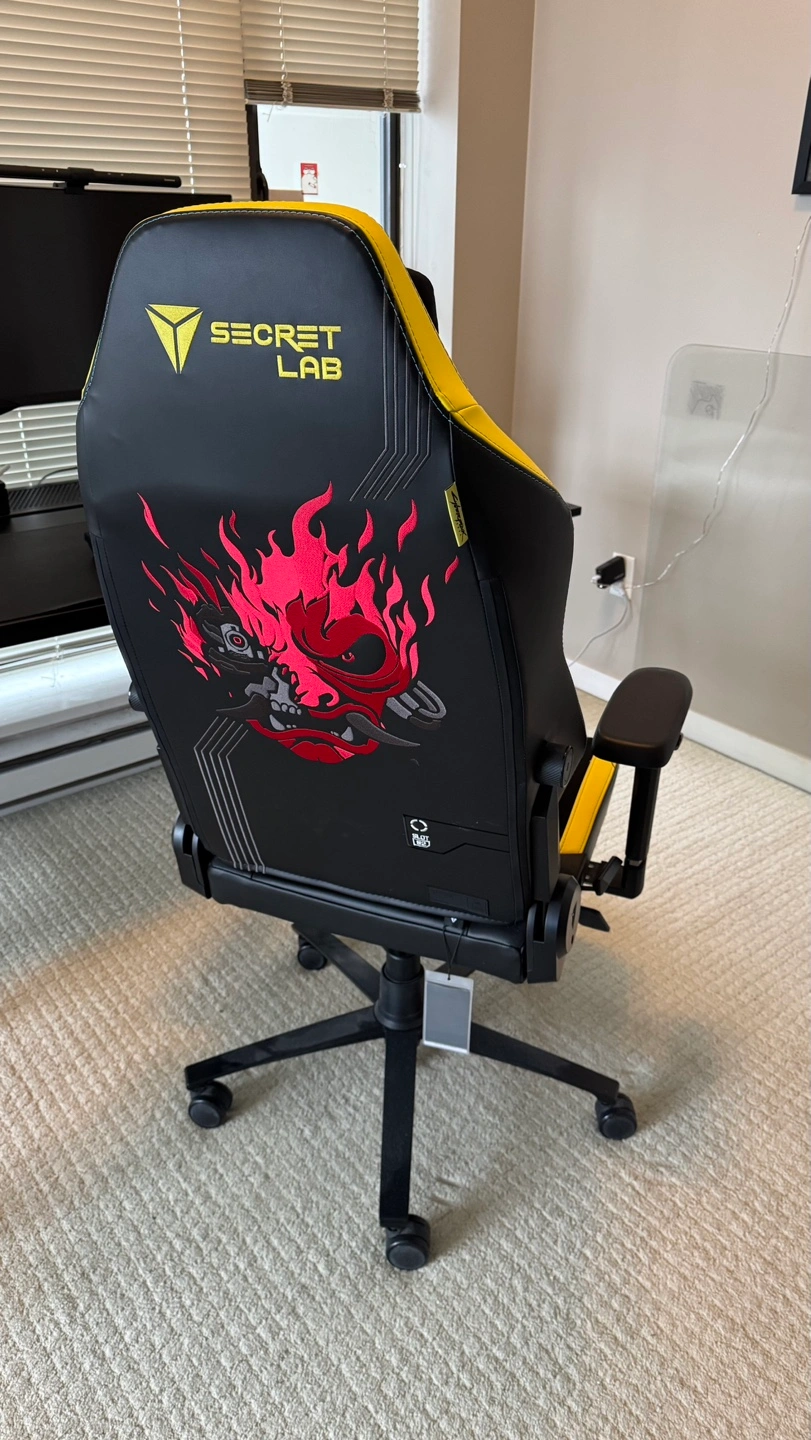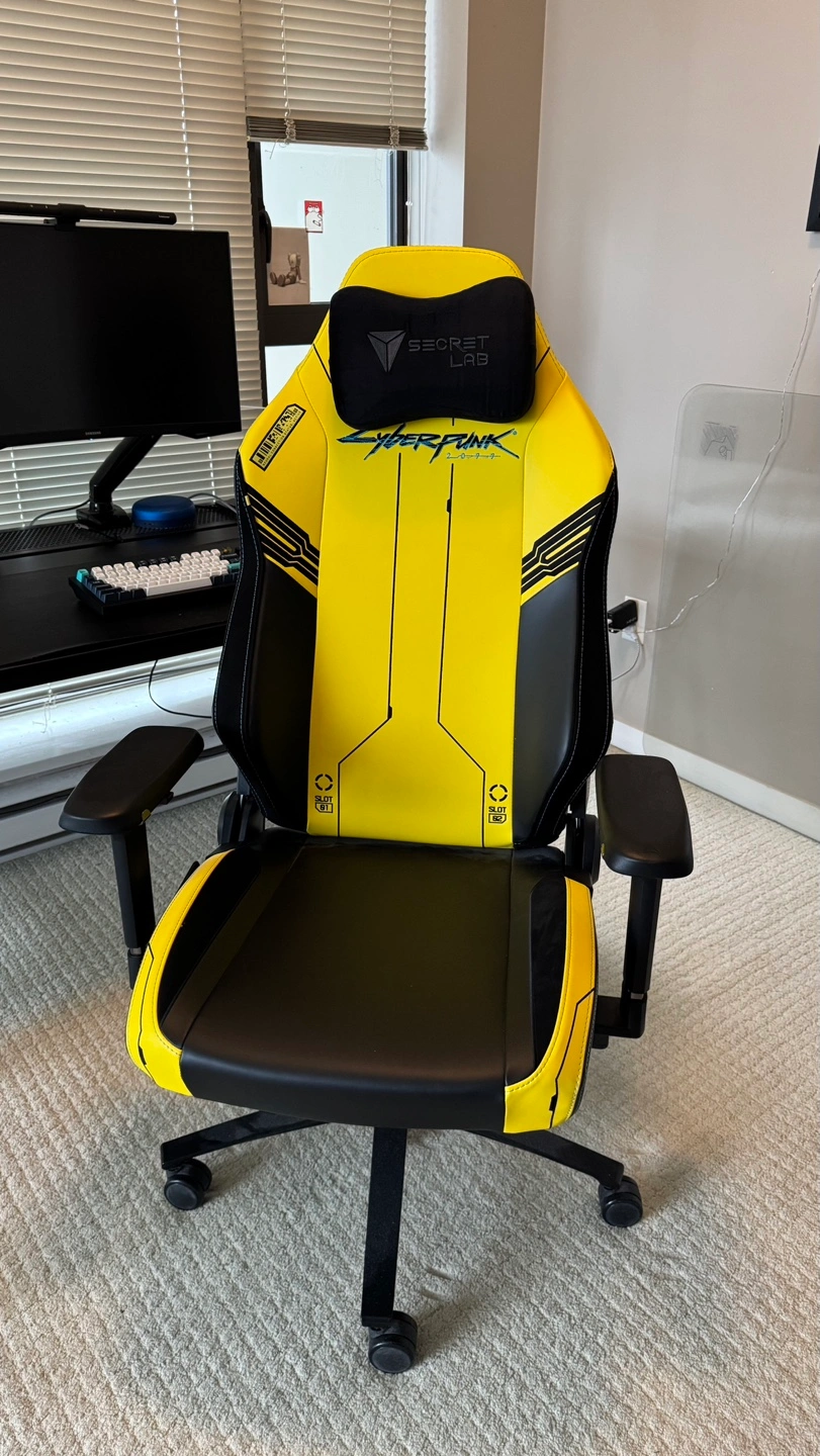 Secretlab gaming chair. Cyberpunk 2077 edition. Yellow and black colour scheme. Adjustable armrests. Headrest and lumbar support included. Excellent condition.