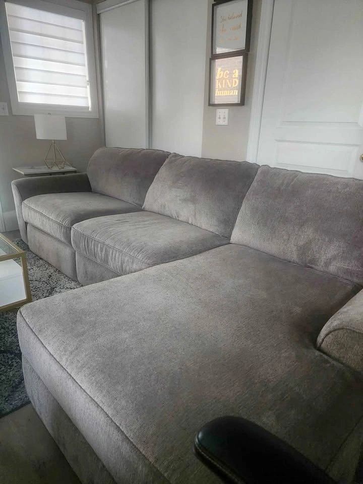 I'm selling my L-shaped sofa with electric recliner, storage, and a chaise that lifts for extra storage. There's also a drawer in the middle section. Bought from Stoney Creek Furniture for $6000, it's barely been used. Price is firm. Dimensions: 9'3" length, 3'3" width, 5'3" chaise.