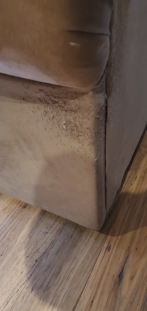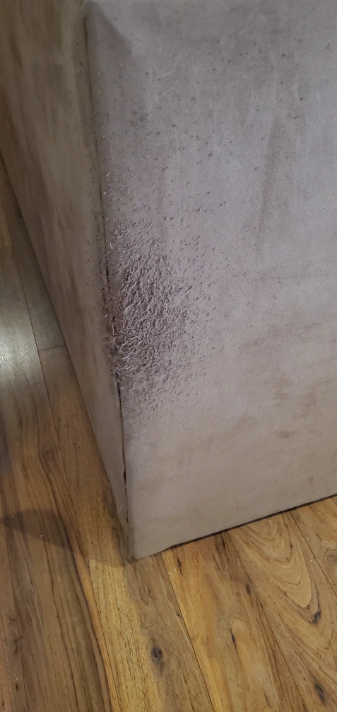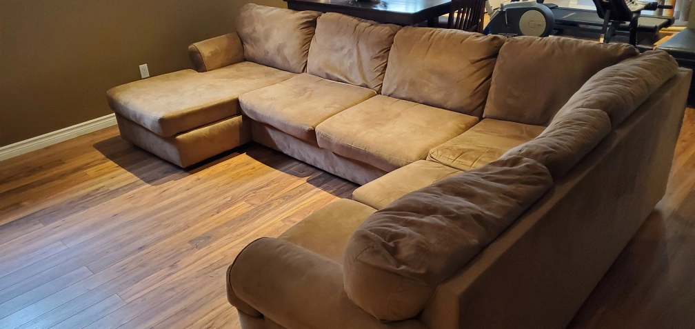 10Sectional with chaise Microfibre - in good condition and easy to clean Used but overall good condition and very comfortable. Some pet damage on corners Disconnects into 3 parts for transport 137" wide Sofa section is 92" long Chaise section is 62" long Each part is 32-36" deep 26" deep cushions Seats are ~18" off floor Perfect for a TV or gaming room Faux leather Ottoman with storage available at an extra cost to be negotiated.