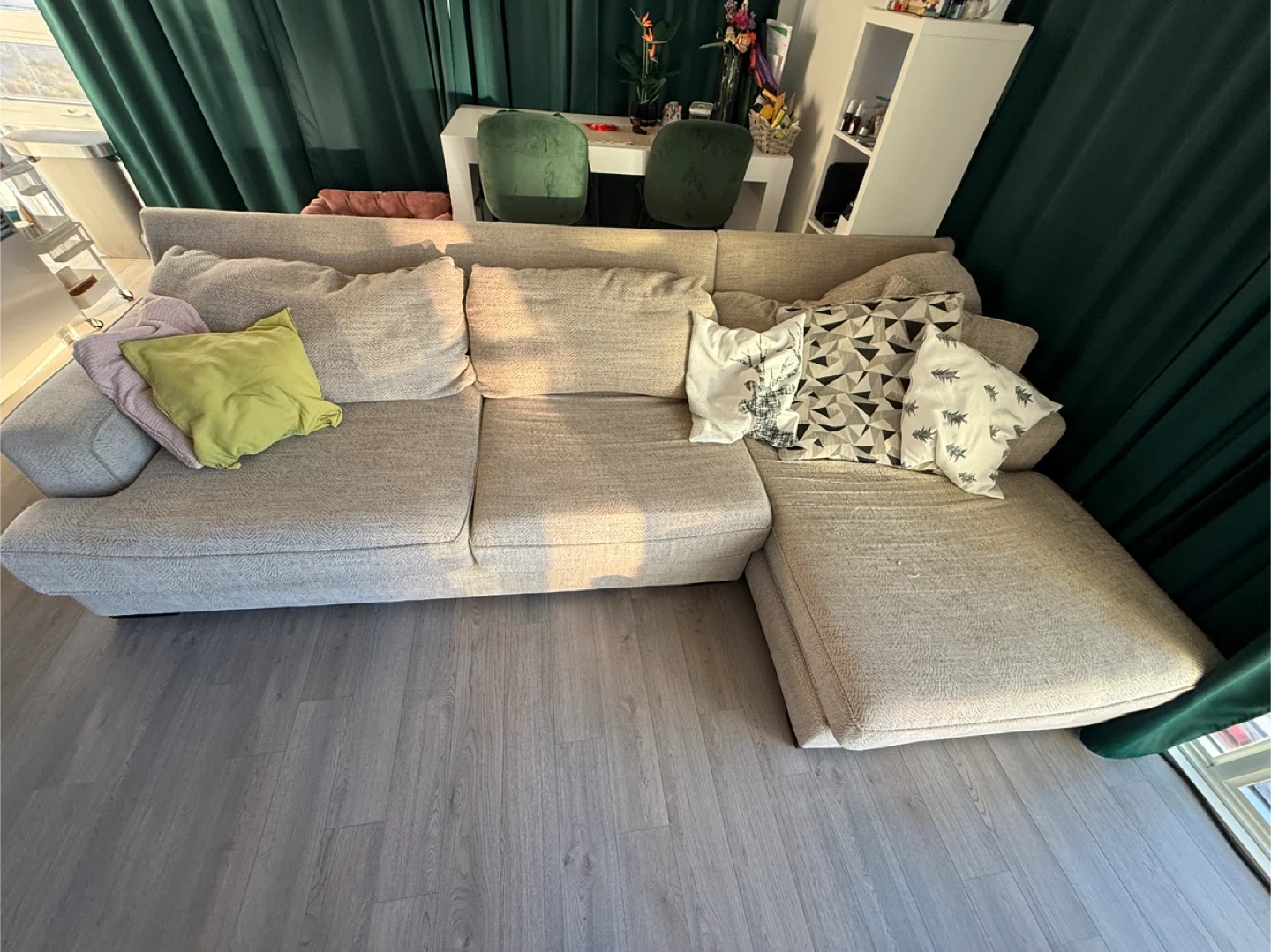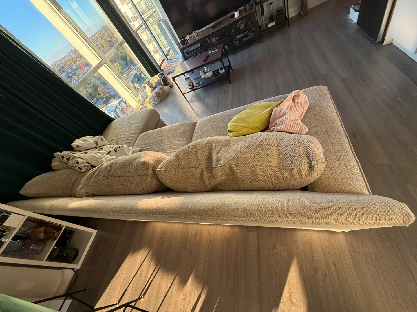 10Selling a comfy sectional sofa! It's in great shape and would be perfect for a living room or family room. The beige colour is neutral and goes with everything. Zip need replacement on two pillows.