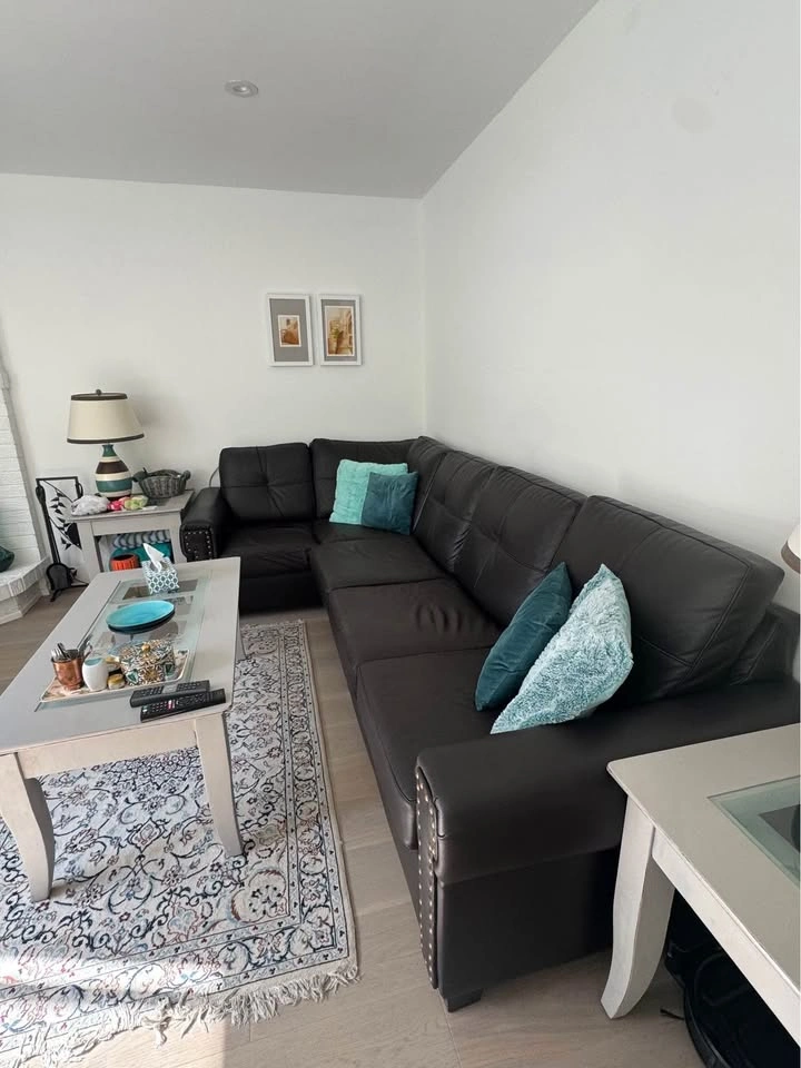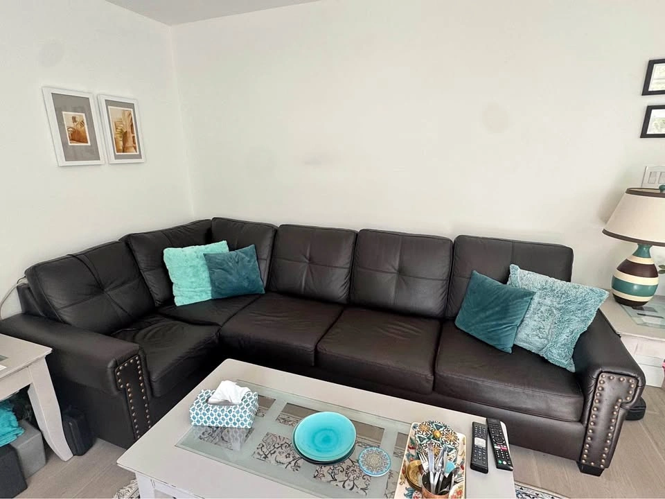 Left side facing L sectional in dark brown air leather, costume made in Canada. In a Pet-free and smoke-free environment. Shows some minor wear on some seats as shown in the pictures and video. 10f long side 5f 3” (63”) short side depth: 3f Material: Air leather Pickup at creditview and Britannia in Mississauga. No delivery, pickup only. Detaches from the middle for easy delivery. Decorative cushions not included.