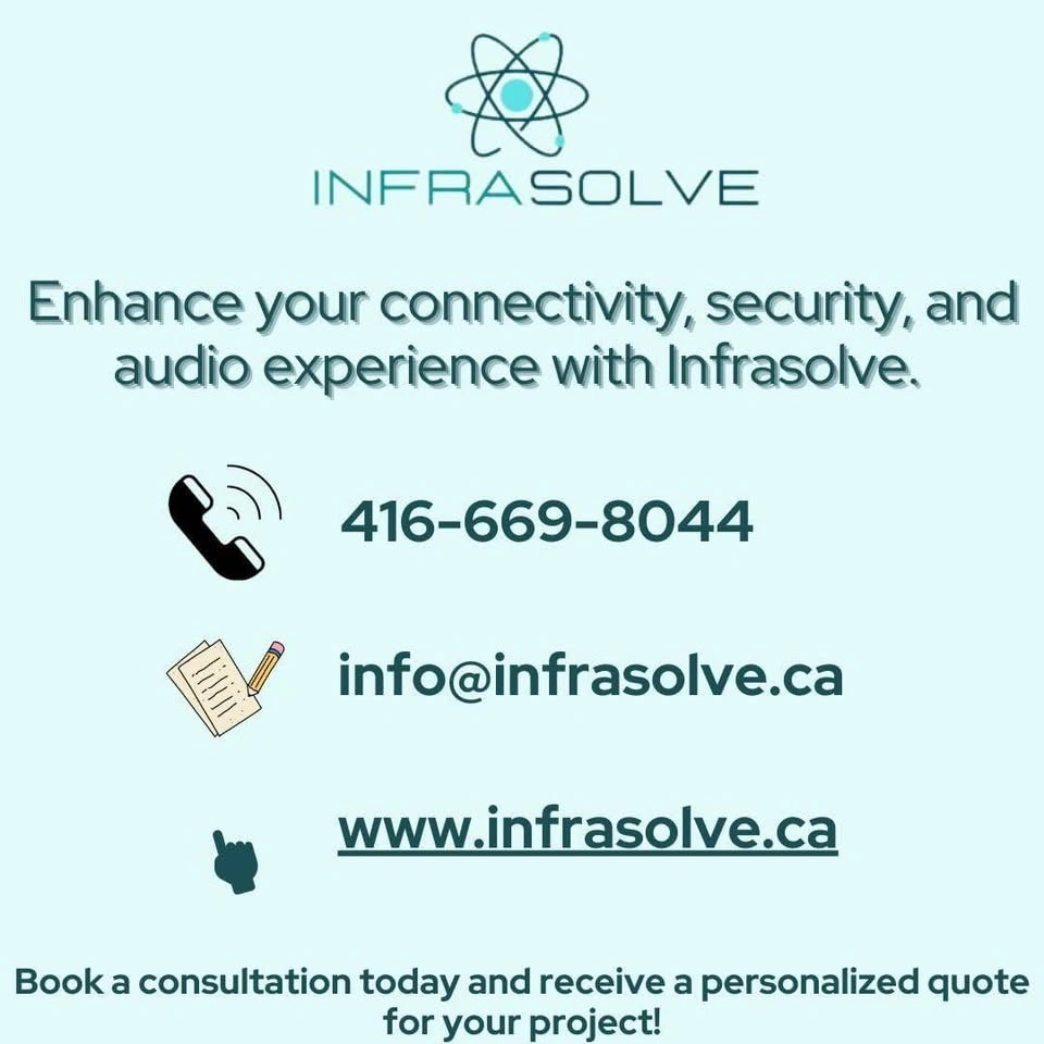 InfraSolve Connect. Secure. Amplify Your Complete Solution for Network Cabling, Security Systems, Audio and Video Installs. Experience Seamless Connectivity, Robust Security, and Exceptional Audio/Video. - Security System Installations - State-of-the-art surveillance and access control. - Customized security solutions for your unique needs - Router and Network Setup - Cat6/Cat5e Data Cabling - Access Control Installation - Network and Phone Cable Relocation/Replacement - Wi-Fi Access Point Installation for Extended Coverage - Commercial displays mounting and configuration - Tailored audio solutions for any space. - Professional installation and support. *** WE DO NOT DEAL IN RESIDENTIAL INSTALLS ***