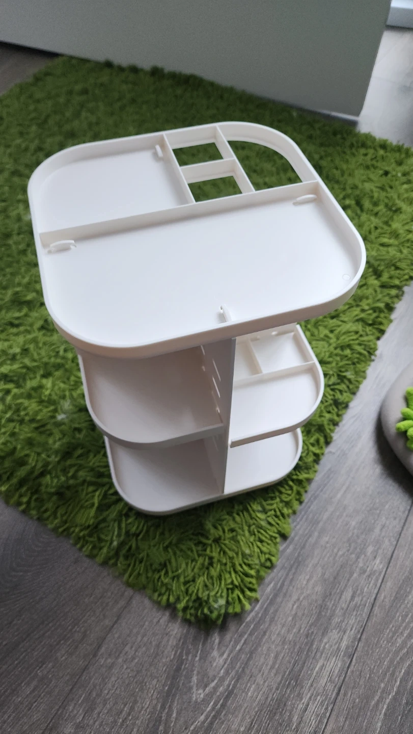 Selling a brand new never used white color Jerrybox 360° rotation cosmetic organizer. It's in mint condition and comes with the box! It has adjustable height levels for each platform and provides multi-dimensional storage as it can freely spin 360 degrees for quick access to any side for easy organization and it helps on saving counter space!