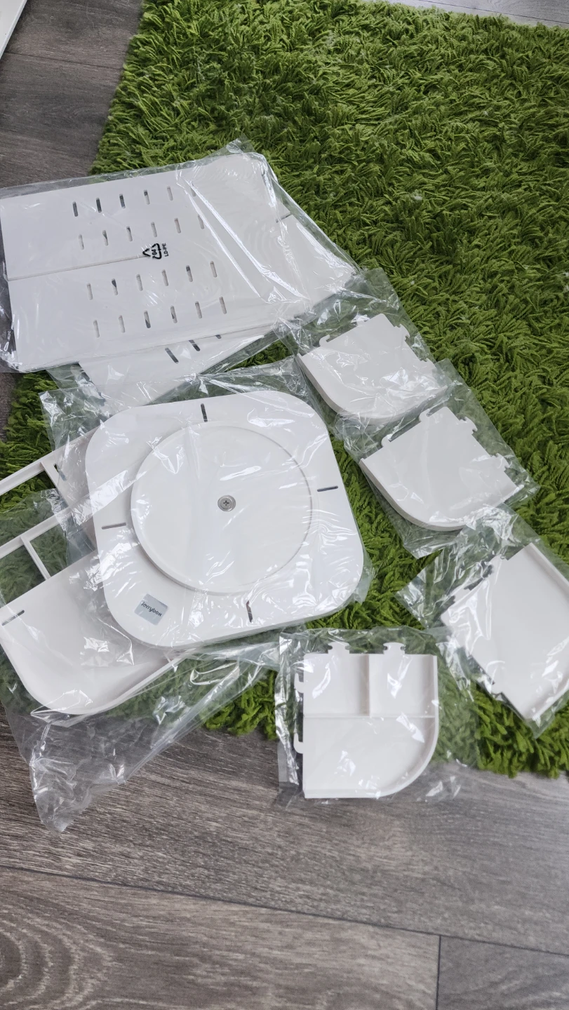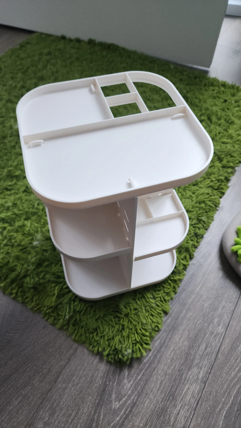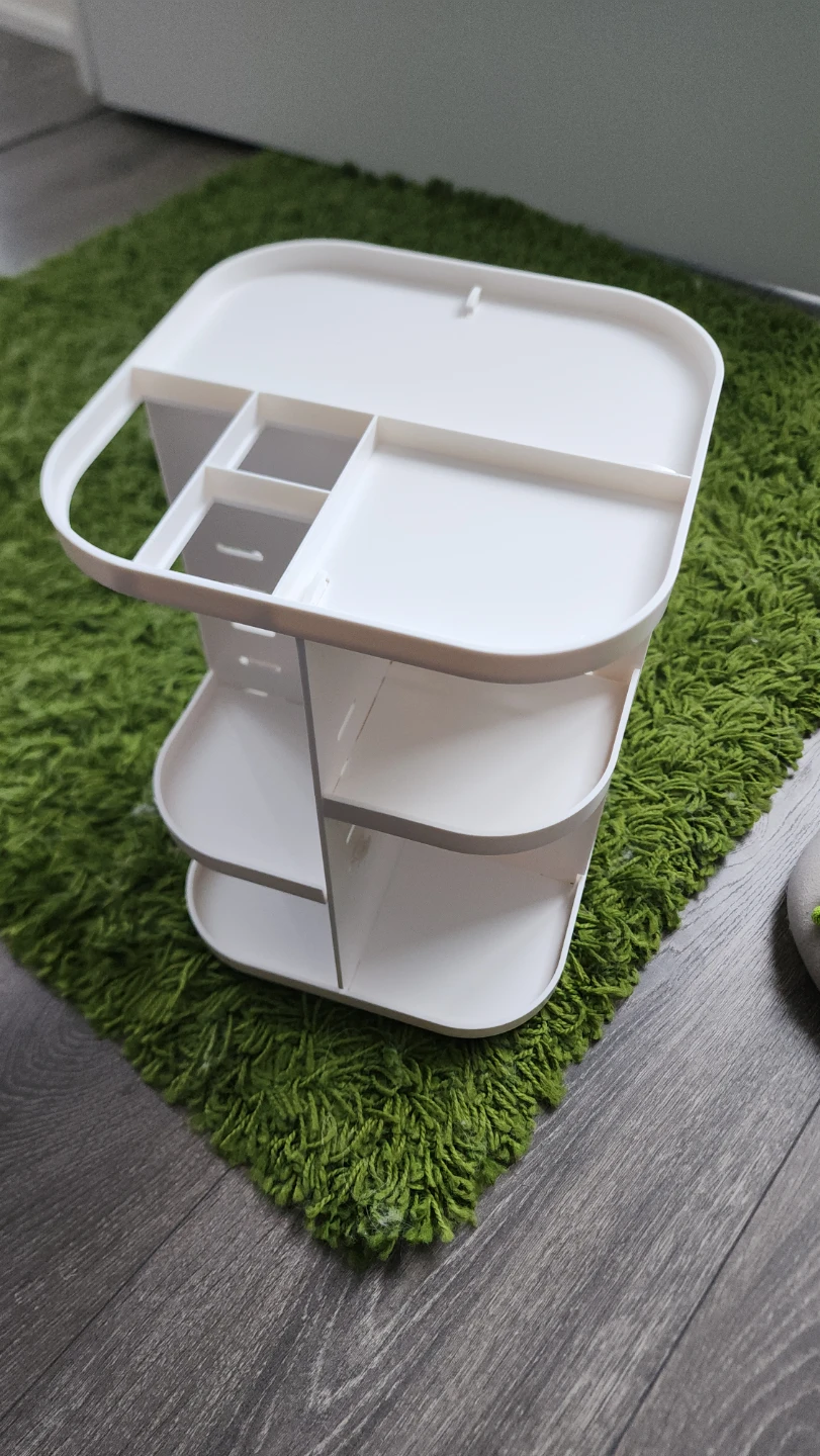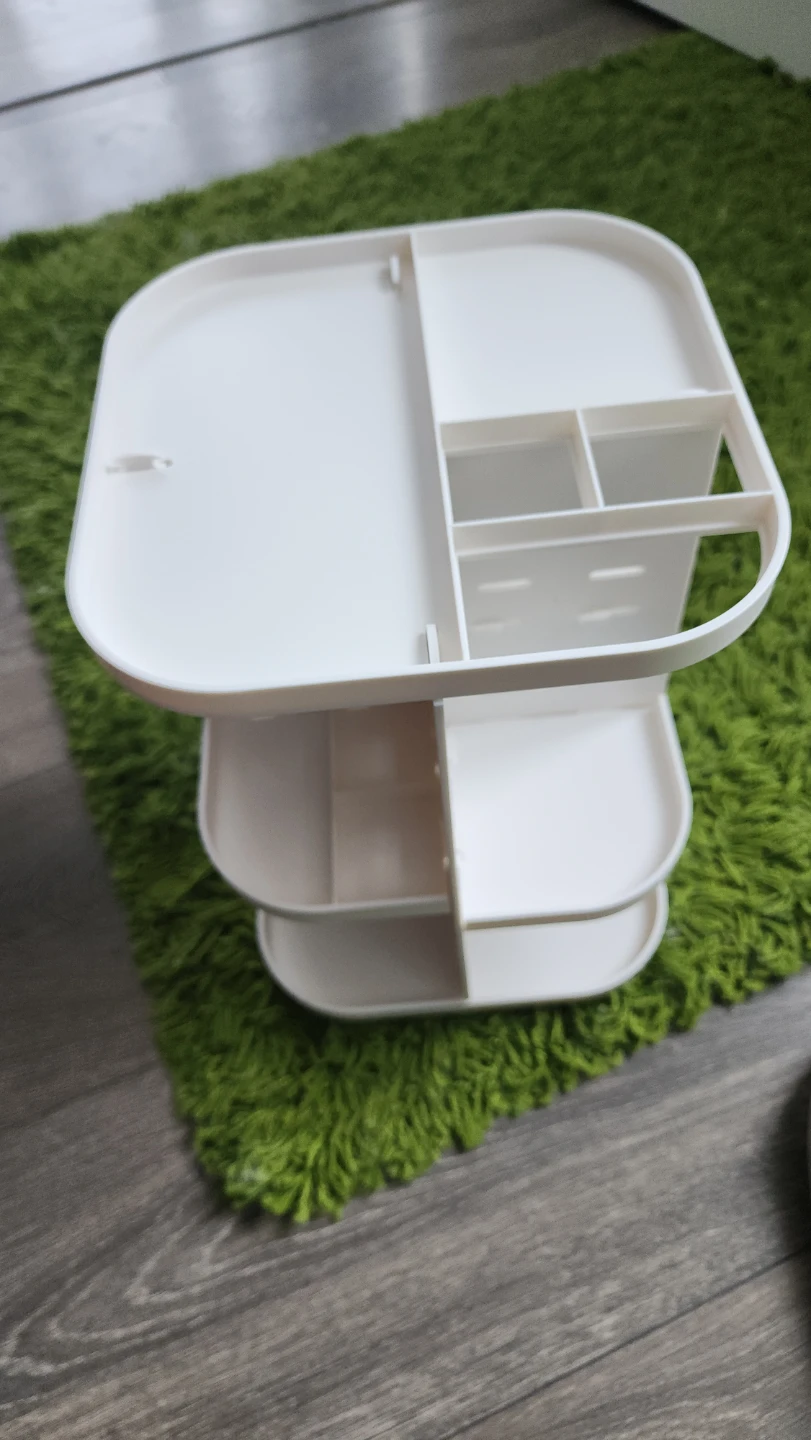 Selling a brand new never used white color Jerrybox 360° rotation cosmetic organizer. It's in mint condition and comes with the box! It has adjustable height levels for each platform and provides multi-dimensional storage as it can freely spin 360 degrees for quick access to any side for easy organization and it helps on saving counter space!