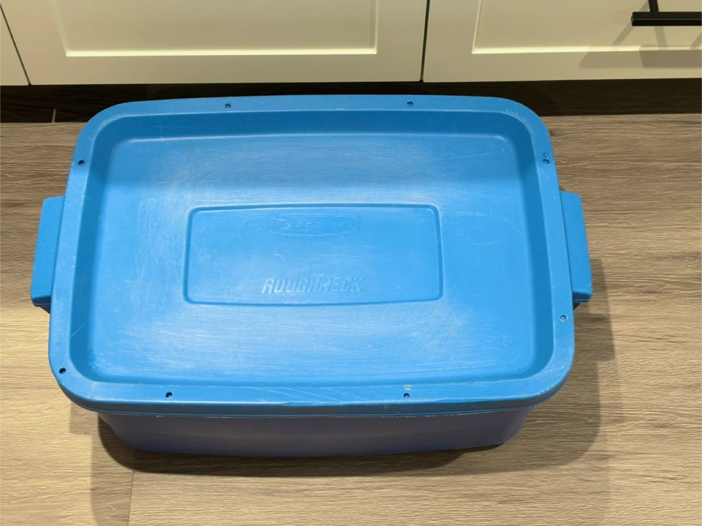 Blue Rubbermaid Roughneck storage bin with lid. It's made of durable plastic. This bin is great for organizing different items around the house.