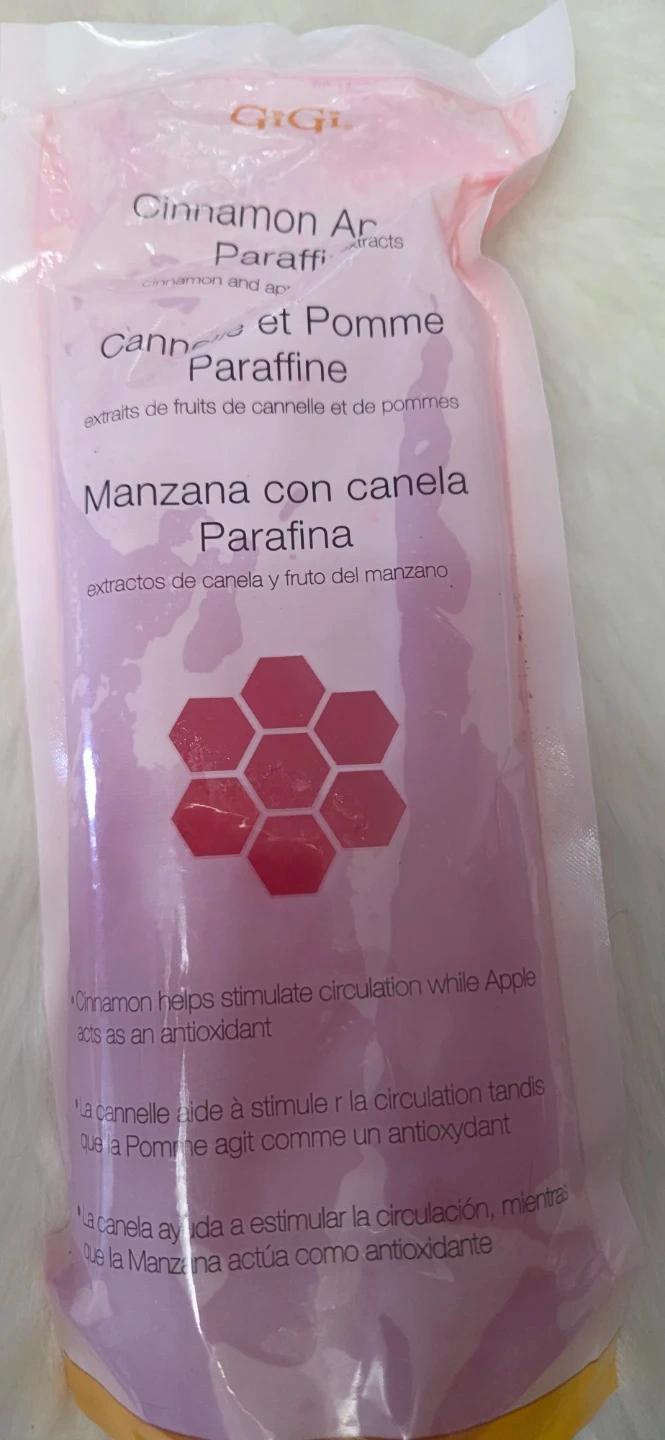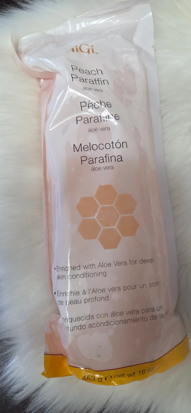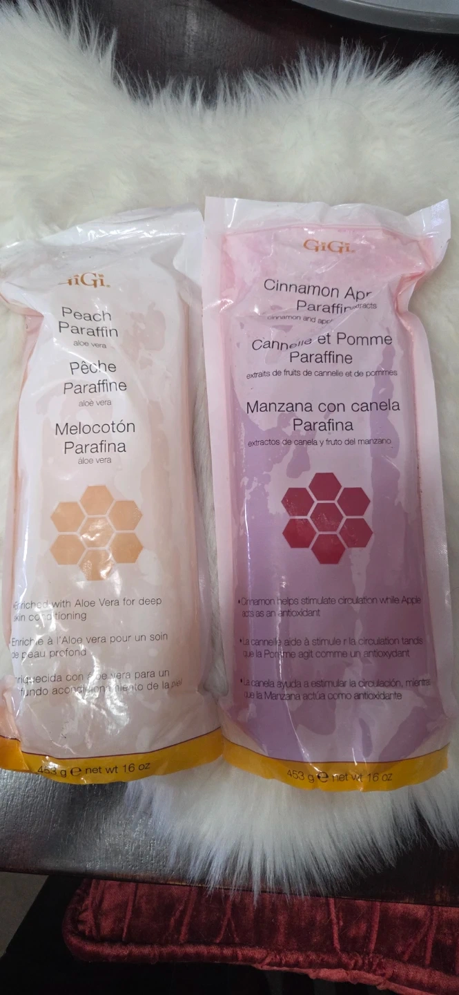 GiGi Peach Paraffin is enriched with Aloe Vera for deep skin conditioning. It contains paraffin, mineral oil, and fragrances. This product is suitable for professional use. $10 each, or $15 for both waxes.