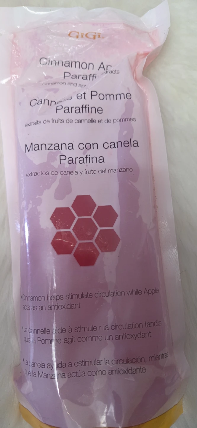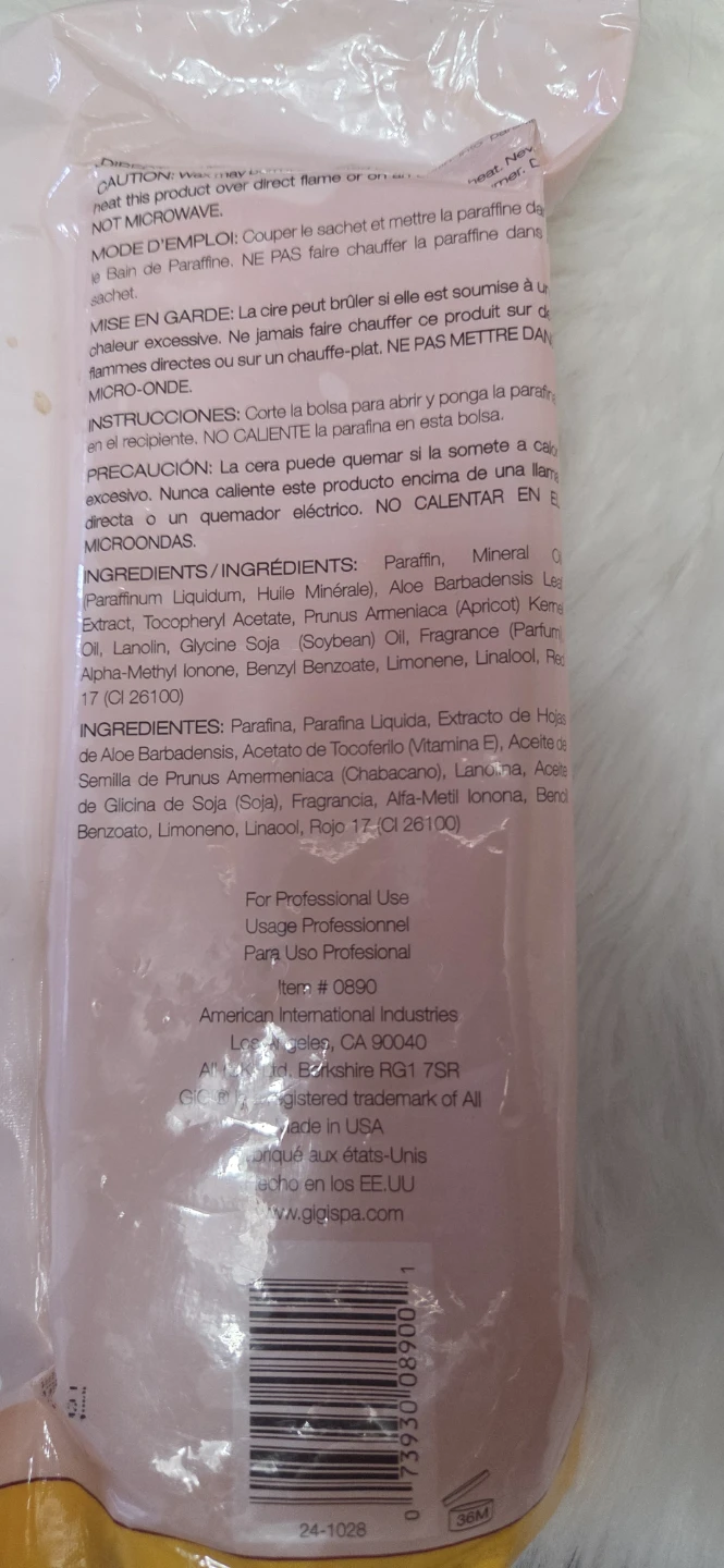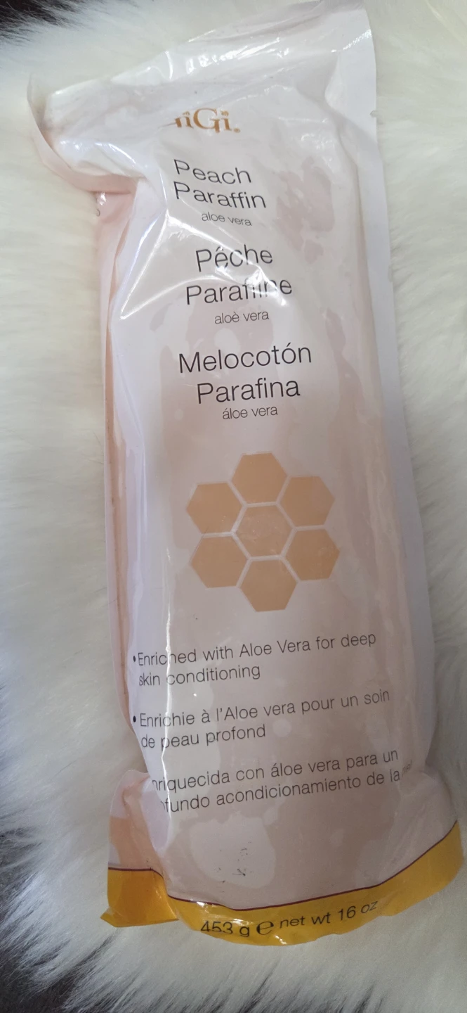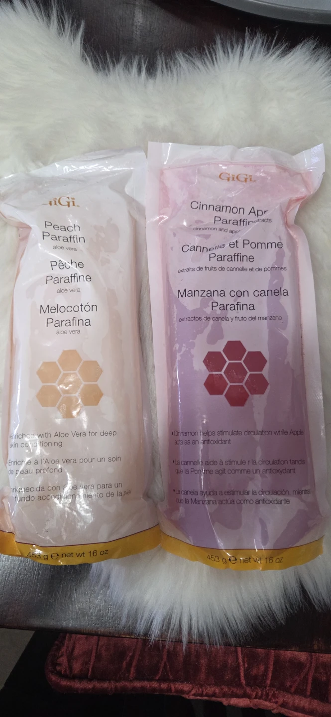 GiGi Peach Paraffin is enriched with Aloe Vera for deep skin conditioning. It contains paraffin, mineral oil, and fragrances. This product is suitable for professional use. $10 each, or $15 for both waxes.