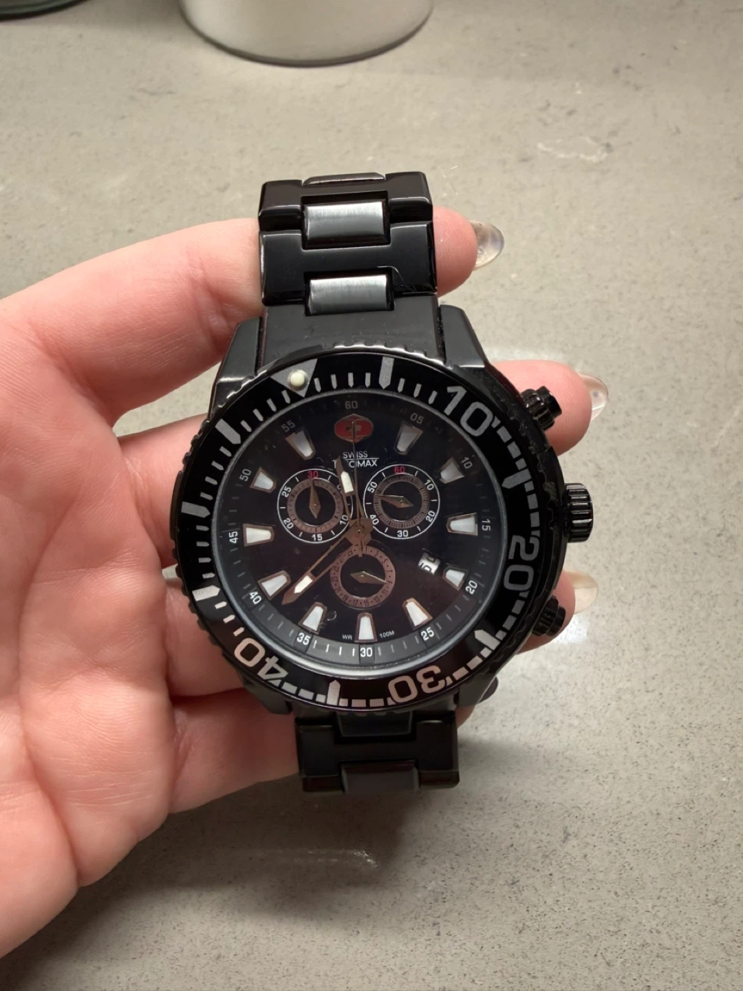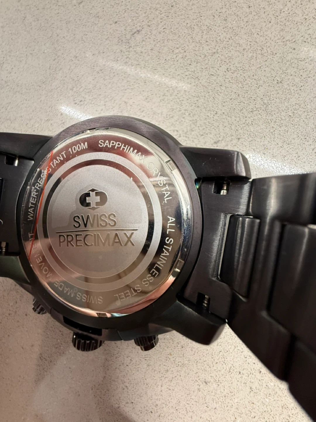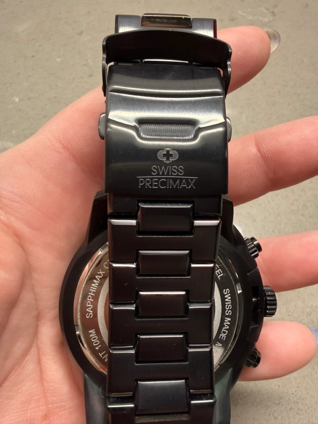 This is a Swiss Precimax watch with a sleek black design, perfect for adding a touch of sophistication to any outfit. The watch is in used, but good condition, as you can see from the photos.