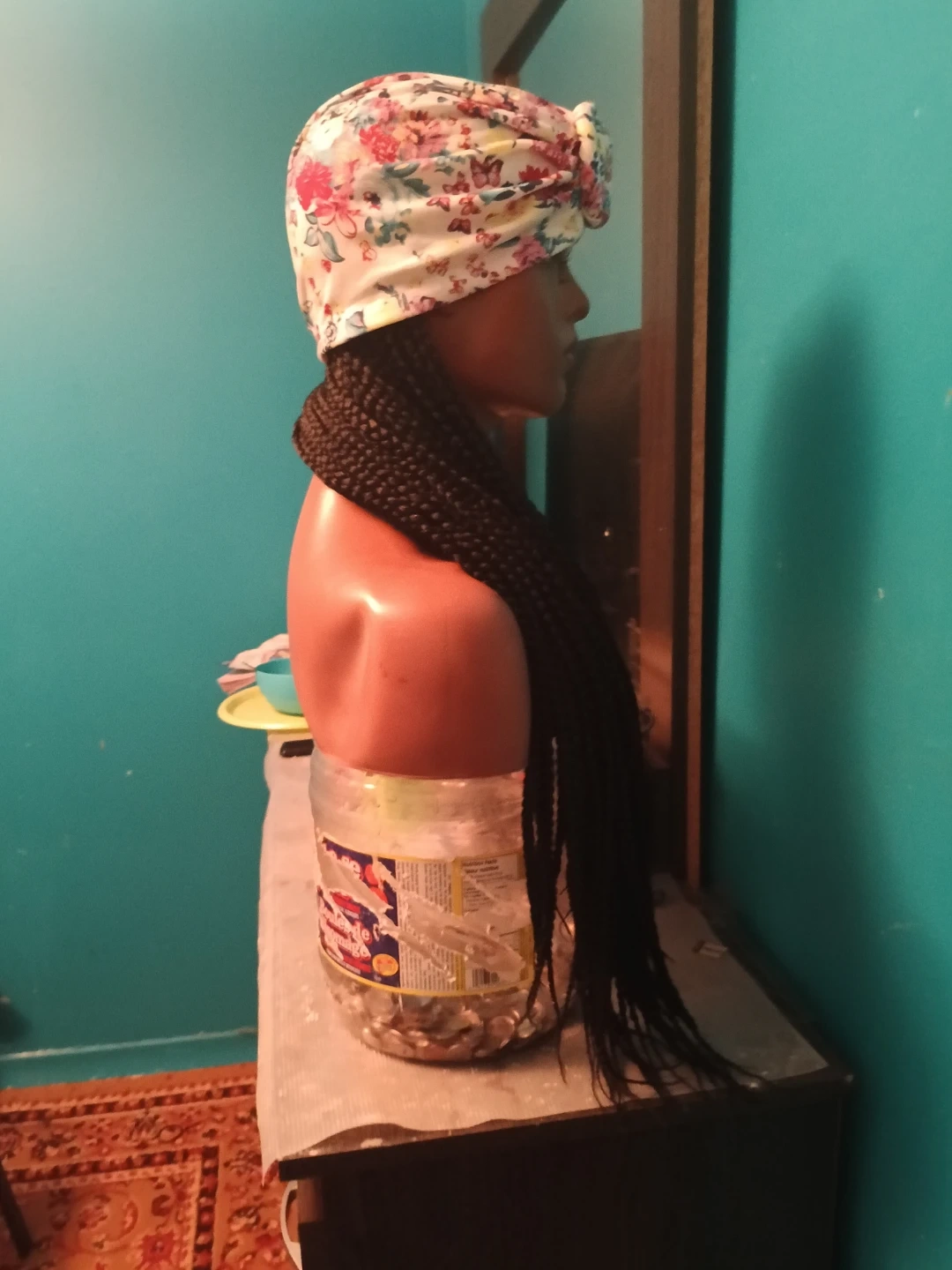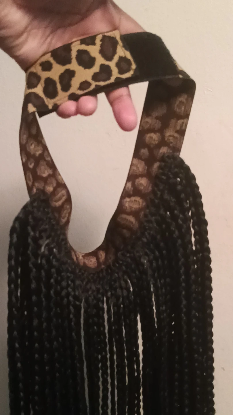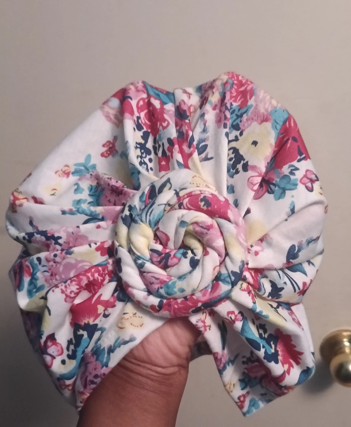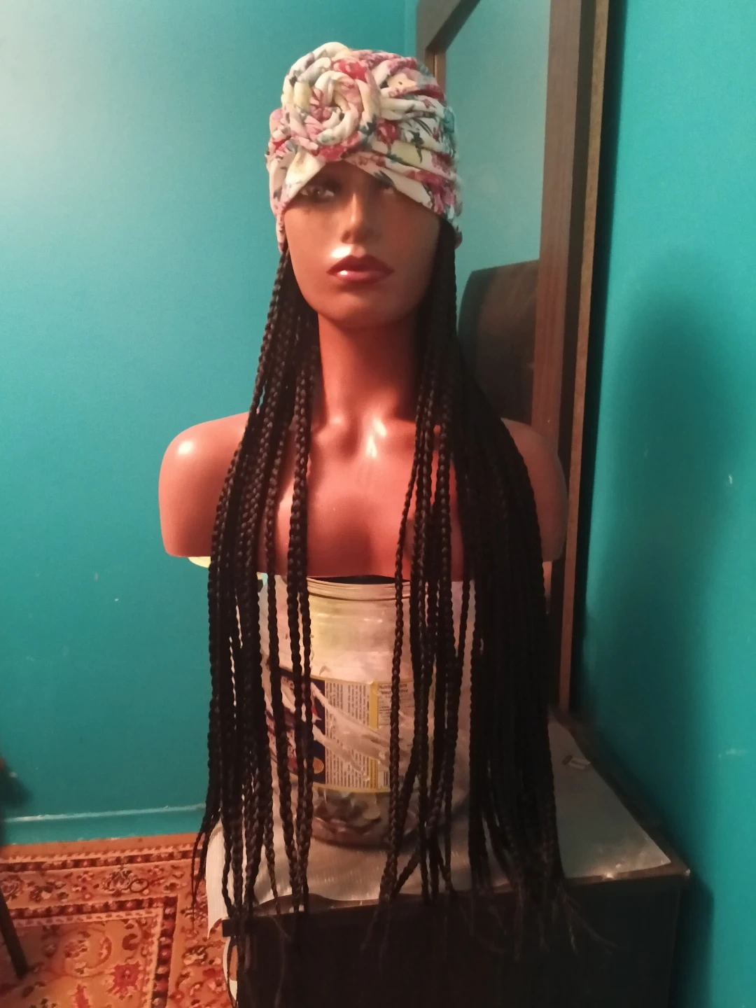I have a floral turban and a braided wig available. The turban features a beautiful floral design with a central rose detail. The wig has long, black braids and a leopard print headband. It's a stylish combination!