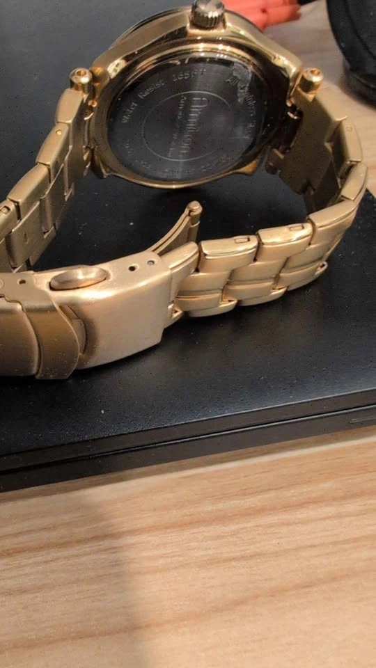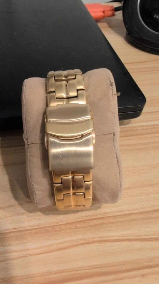 Gold plated with sapphire glass and quartz movement. Features opal bezel inserts, day/date, and a 12/24 hr chronograph dial. Hardly worn.