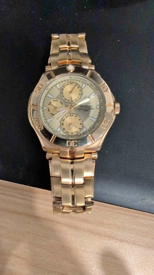 Gold plated with sapphire glass and quartz movement. Features opal bezel inserts, day/date, and a 12/24 hr chronograph dial. Hardly worn.