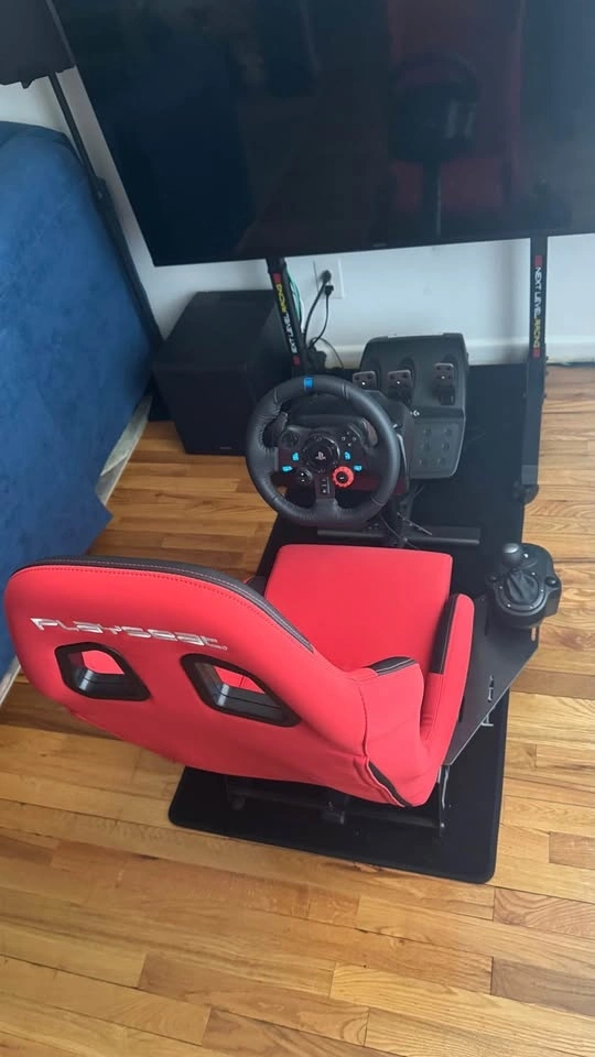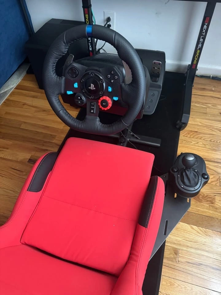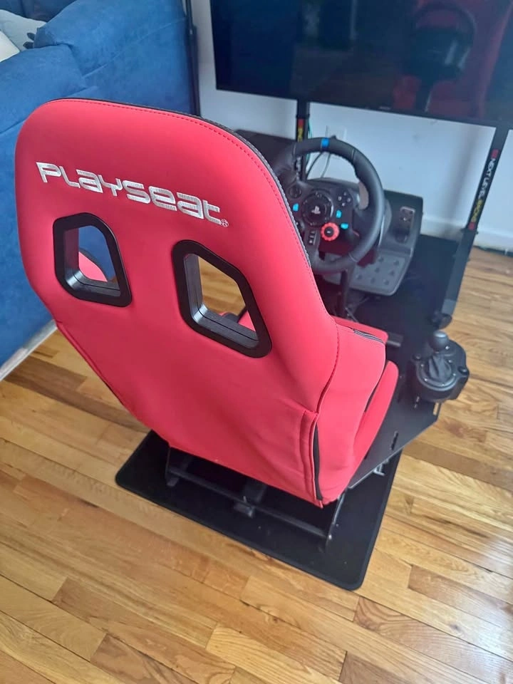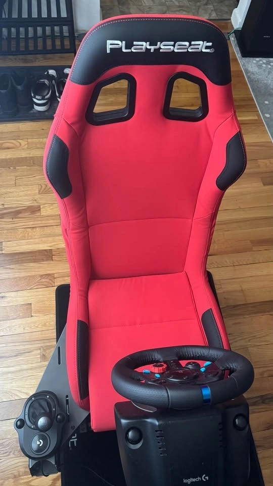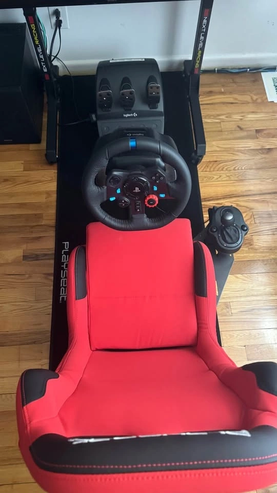 Full racing simulator setup, barely used (about 10 times). Includes Logitech G29 Driving Force Racing Wheel with pedals, Force Feedback, and paddle shifters (compatible with PS5, PS4, PC, Mac). Also includes the Logitech G Driving Force Shifter, a Playseat Evolution with a red seat, a Playseat Gear Shift Holder PRO, and a Playseat Floor Mat XL for floor protection. Ready to go!