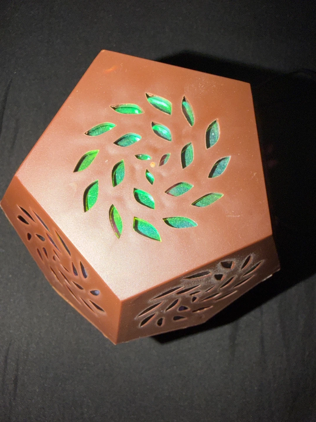 Brown hexagonal decorative lamp with cut-out leaf pattern. It's powered by USB and has colored lights that shine through the openings. Perfect for adding a cozy ambiance!