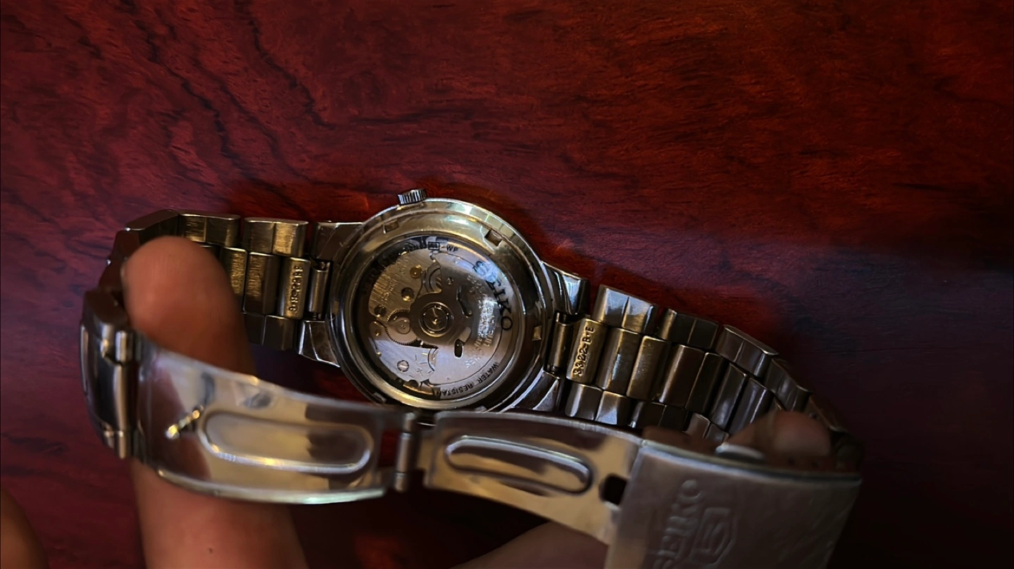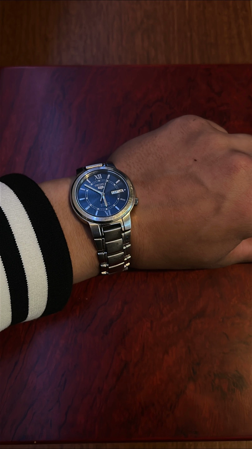 Selling a Seiko automatic watch with a striking blue face. It's in good condition and has a stainless steel band. The watch features a day and date display. A classic timepiece ready for a new wrist!