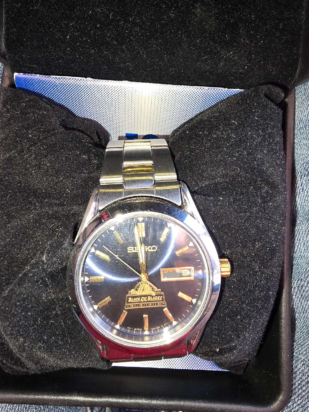 104Selling a Seiko watch with a black dial. It comes with its original box. It has a stainless steel and gold-tone band. The watch has never been worn its alwsys been on its pillow.