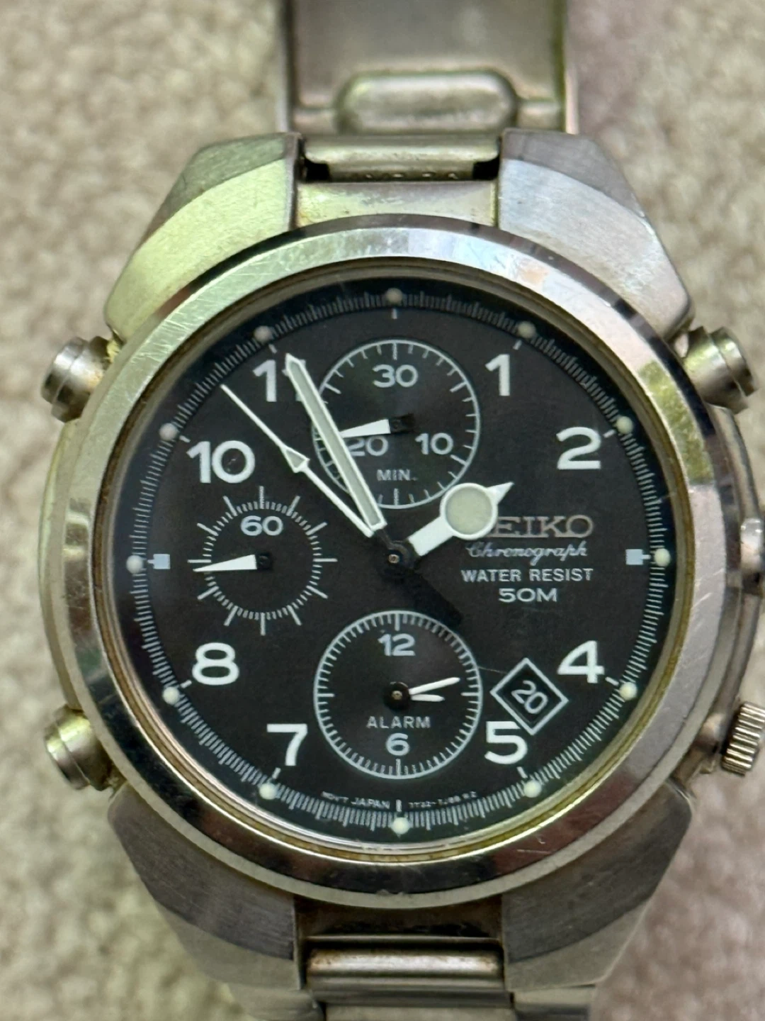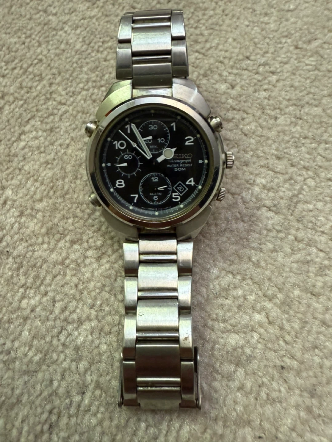27Not sure work or not Selling a Seiko Chronograph watch! It's water resistant to 50M. This stylish watch has a black face with chronograph functions and a stainless steel band. It's in good condition and ready for a new wrist!