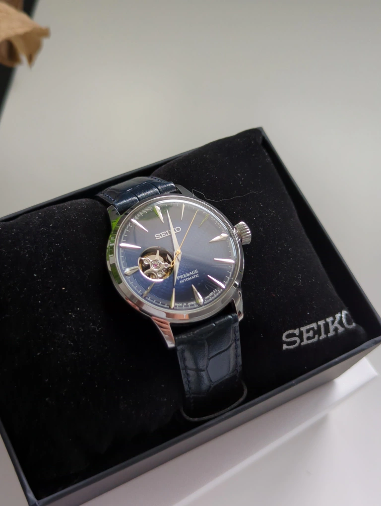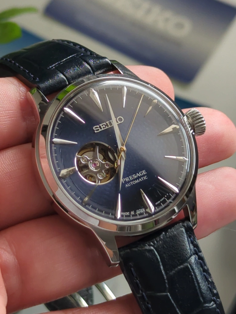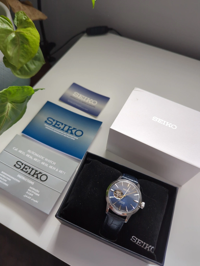For Sale: Men's Seiko PRESAGE Cocktail Time (SSA405) - $500 Looking for a stylish and reliable automatic watch? Look no further than this Seiko PRESAGE Cocktail Time (SSA405)! This watch is in excellent condition and ready to elevate your wrist game. Key Features: * Display: Analog * Movement: Automatic (Caliber 4R38) with manual winding (41-hour power reserve, 24 jewels) * Features: Water Resistant (5 bar), Stop second hand function * Style: Wrist Watch * Model: SSA405 * Collection: Presage Cocktail Time * Case Material: Stainless steel * Case Dimensions: 40.5mm diameter, 11.8mm thickness, 47.5mm lug-to-lug * Crystal: Box-shaped Hardlex * Band Material: Calfskin leather * Clasp: Three-fold clasp with push button release * Lug Width: 20mm * Other Details: See-through & Screw case back * Weight: 70g This Seiko Presage Cocktail Time is a beautiful and sophisticated watch, perfect for any occasion. The automatic movement keeps accurate time, and the classic design will never go out of style. Don't miss out on this fantastic opportunity to own a high-quality Seiko Presage at a great price! Contact me today to arrange a viewing or for more information.
