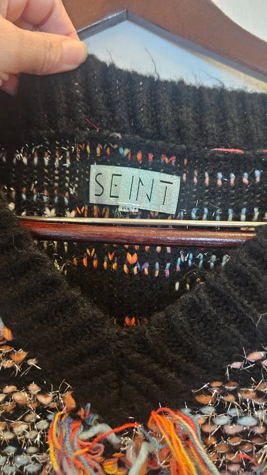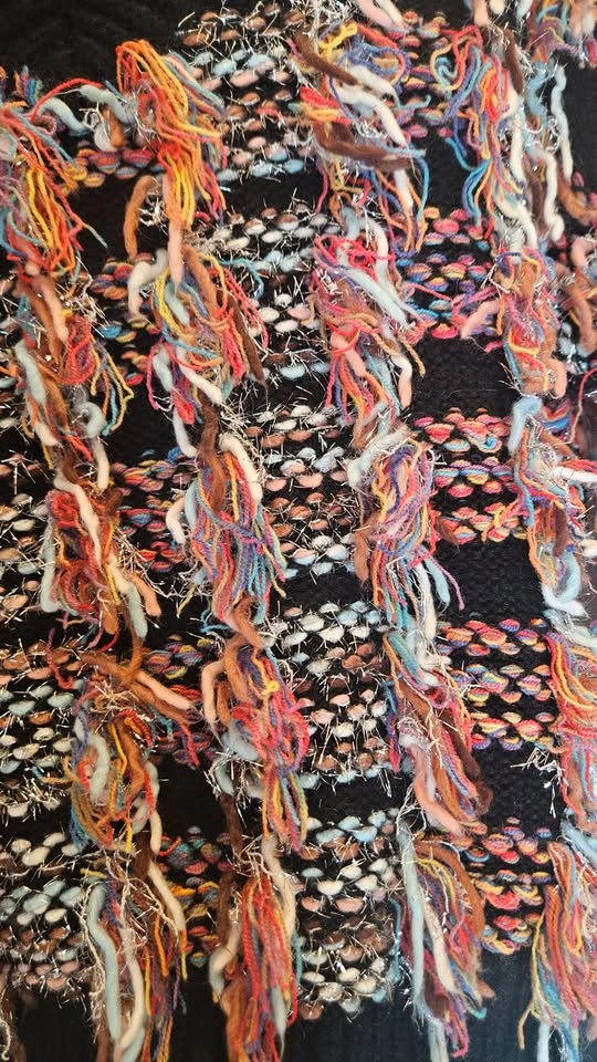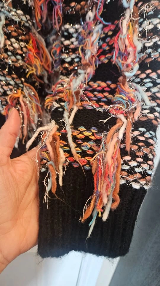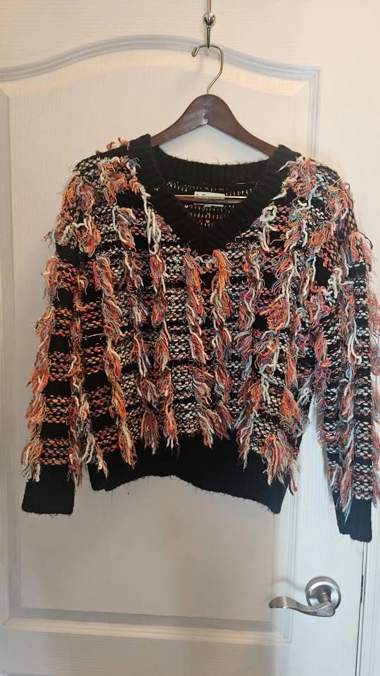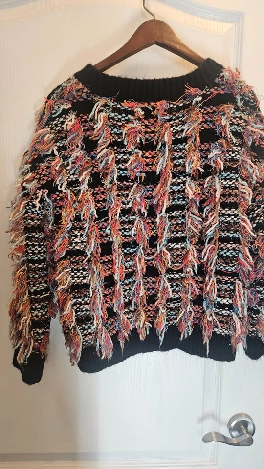 62EUC - Cozy and fun textured knit with multicolored fringe. Black base with pops of red, pink, and white woven throughout for a unique, shaggy look. Slightly oversized fit with long sleeves and a V-neckline finished in ribbed trim. Easy to style with jeans, leggings, or over a dress for a laid-back, boho vibe. Perfect for festival wear, casual nights out, or adding a statement piece to your everyday wardrobe. Closet clearout - check my other listings