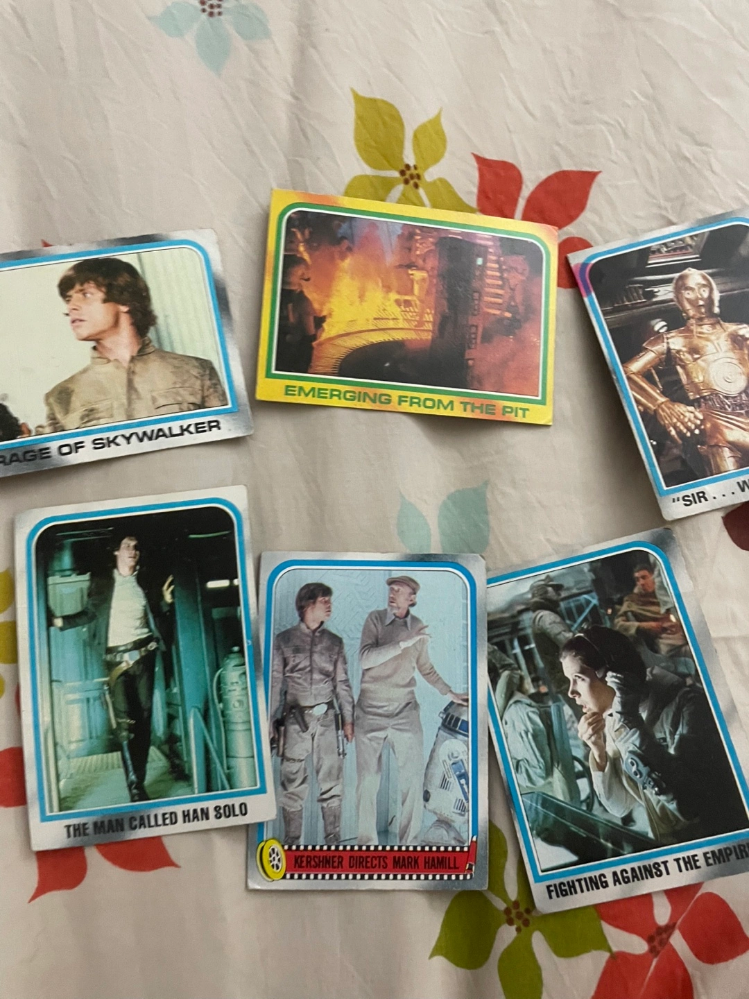 Collection of vintage Star Wars and Teenage Mutant Ninja Turtles trading cards. Includes various scenes and characters. Great for collectors.