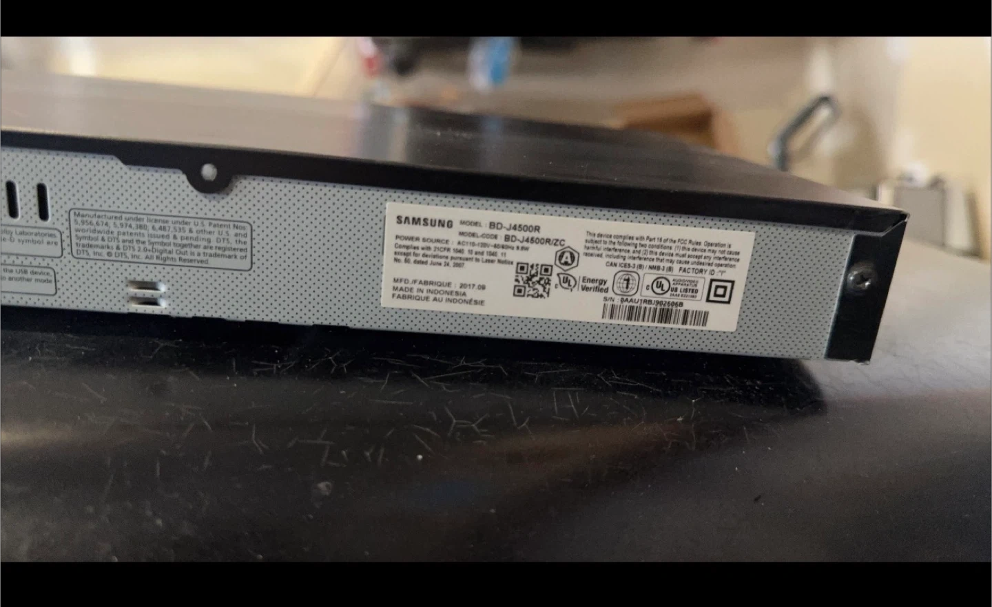 Selling a Samsung BD-J4500R Blu-ray Disc Player. It's in good condition and ready to play your favourite movies! Power source: AC110-120V~50/60Hz 8.8W