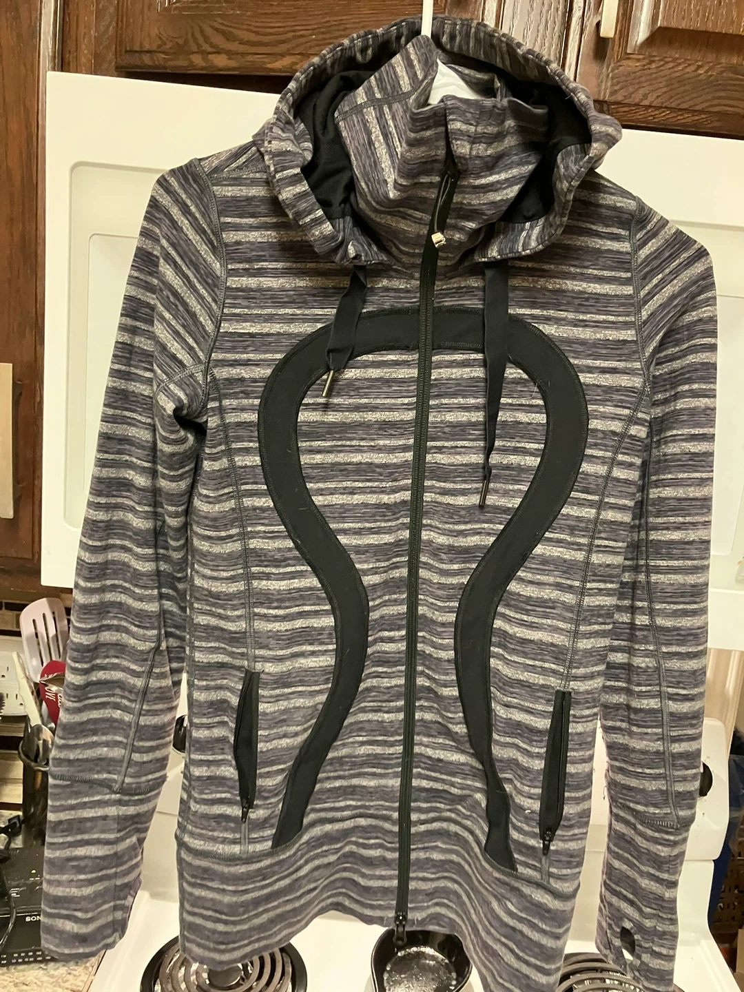 Selling a Lululemon hoodie in a striped pattern! It features a full zip and a cozy hood. The hoodie also has thumb holes on the sleeves, perfect for keeping your hands warm on chilly days. Size4