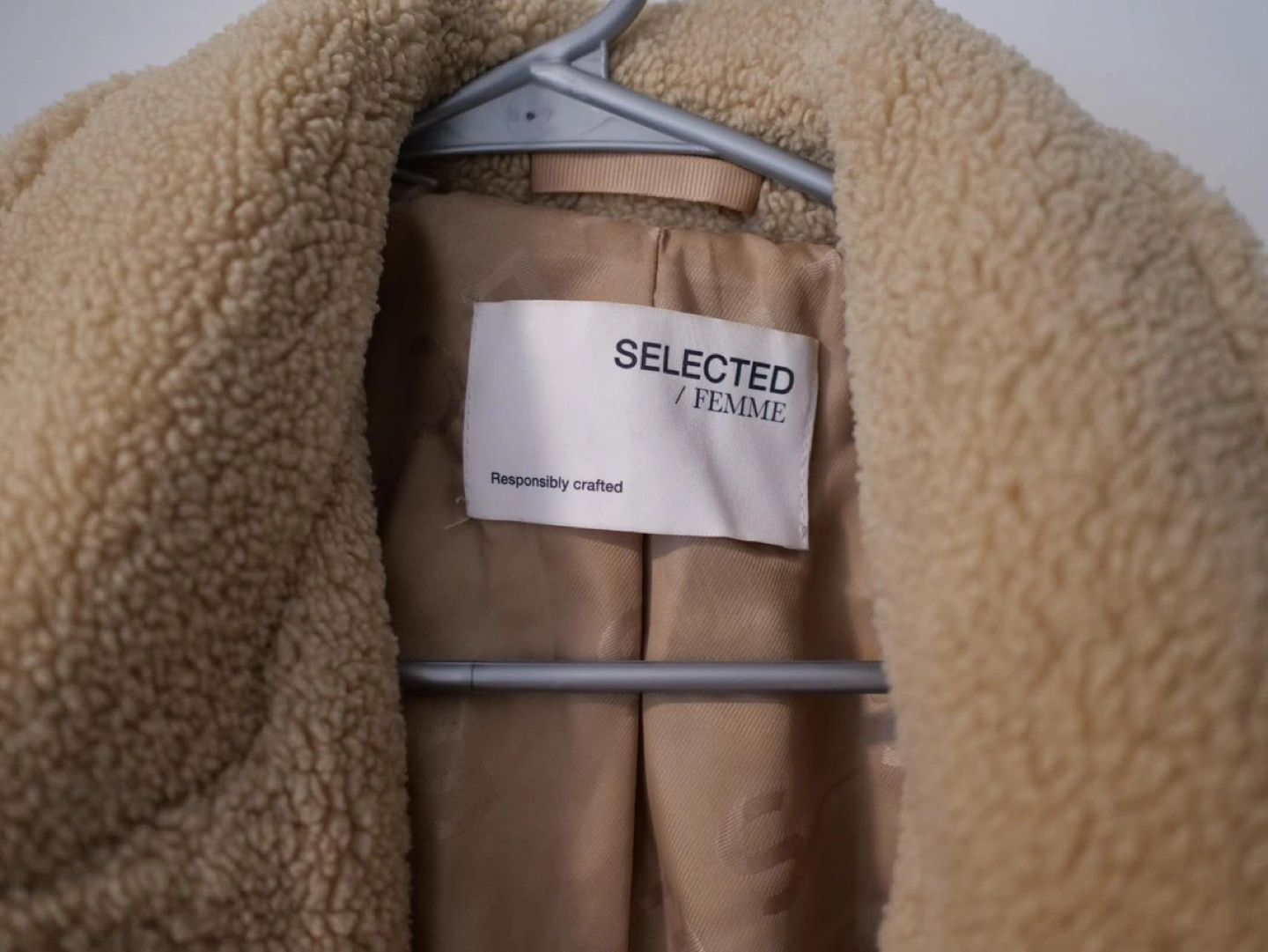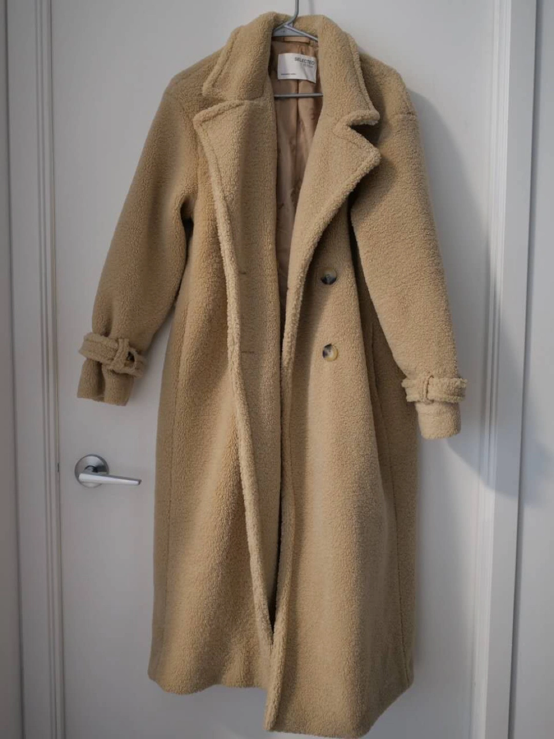 Long beige teddy coat. Features button closure and long sleeves. Responsibly crafted.