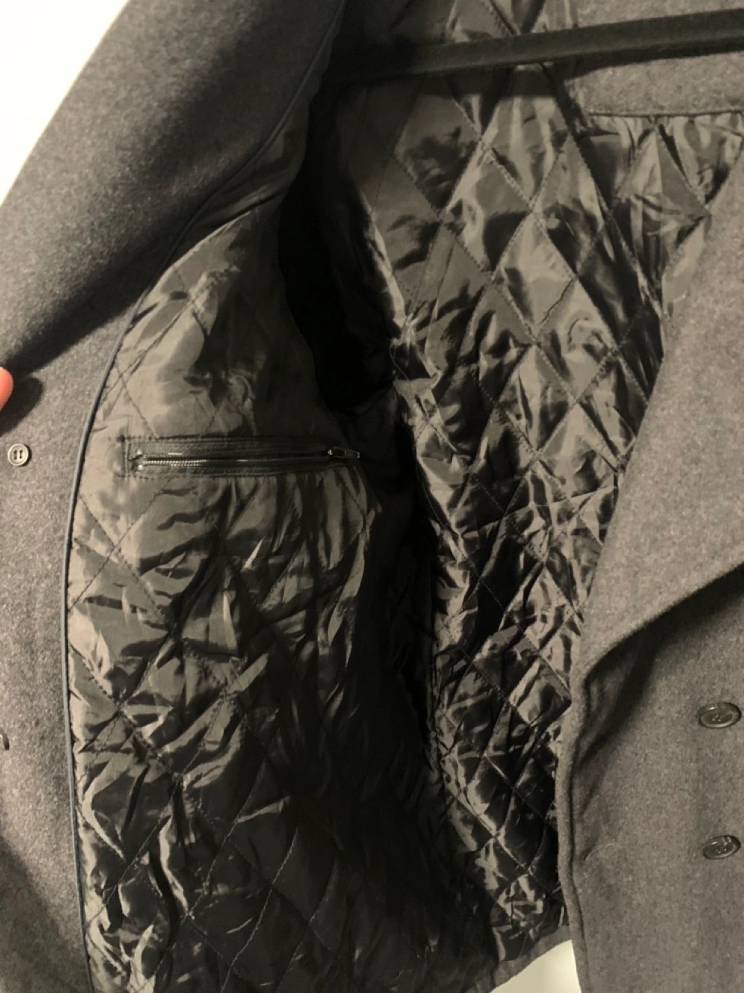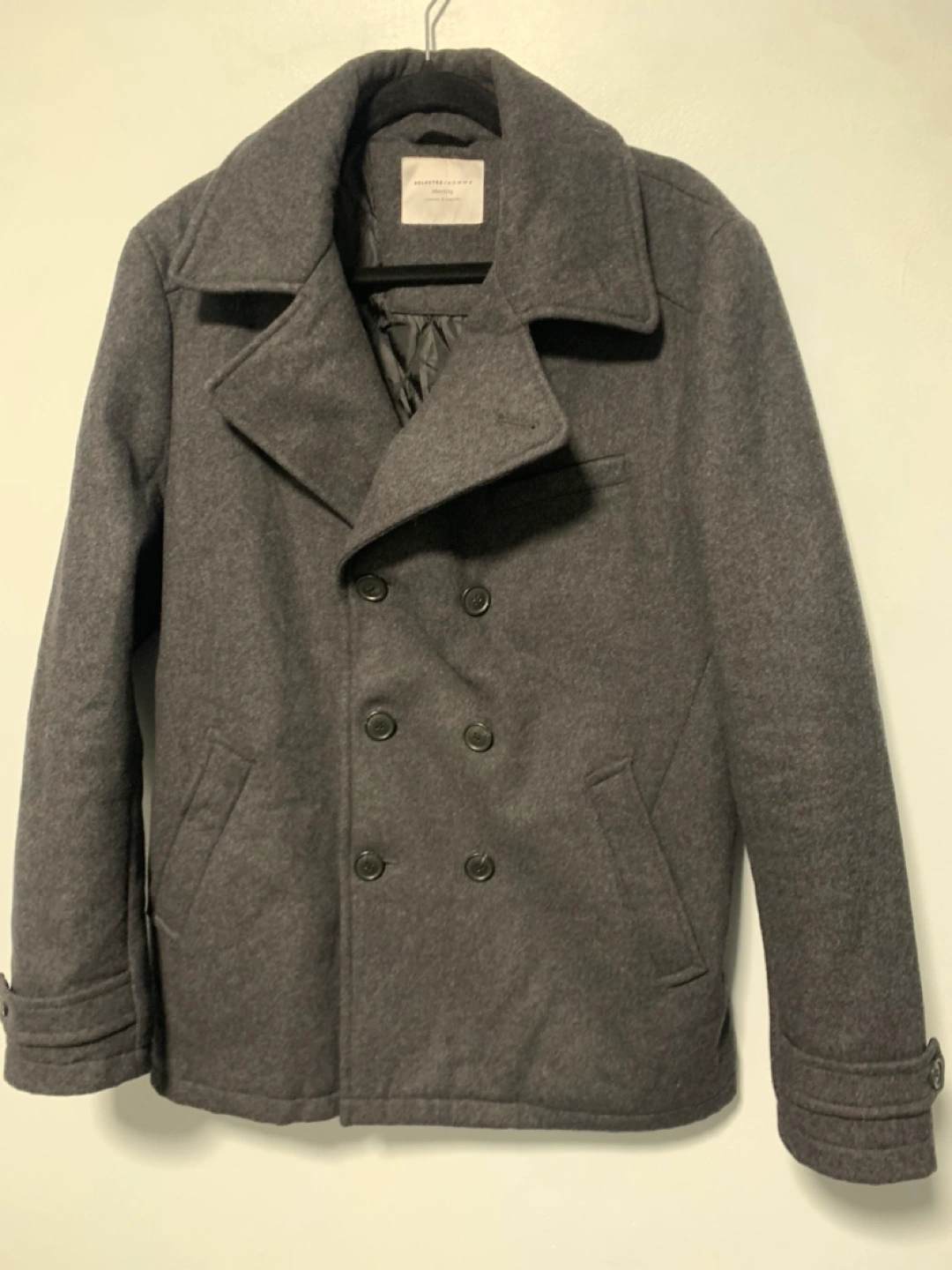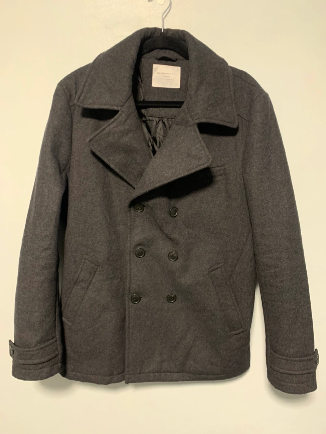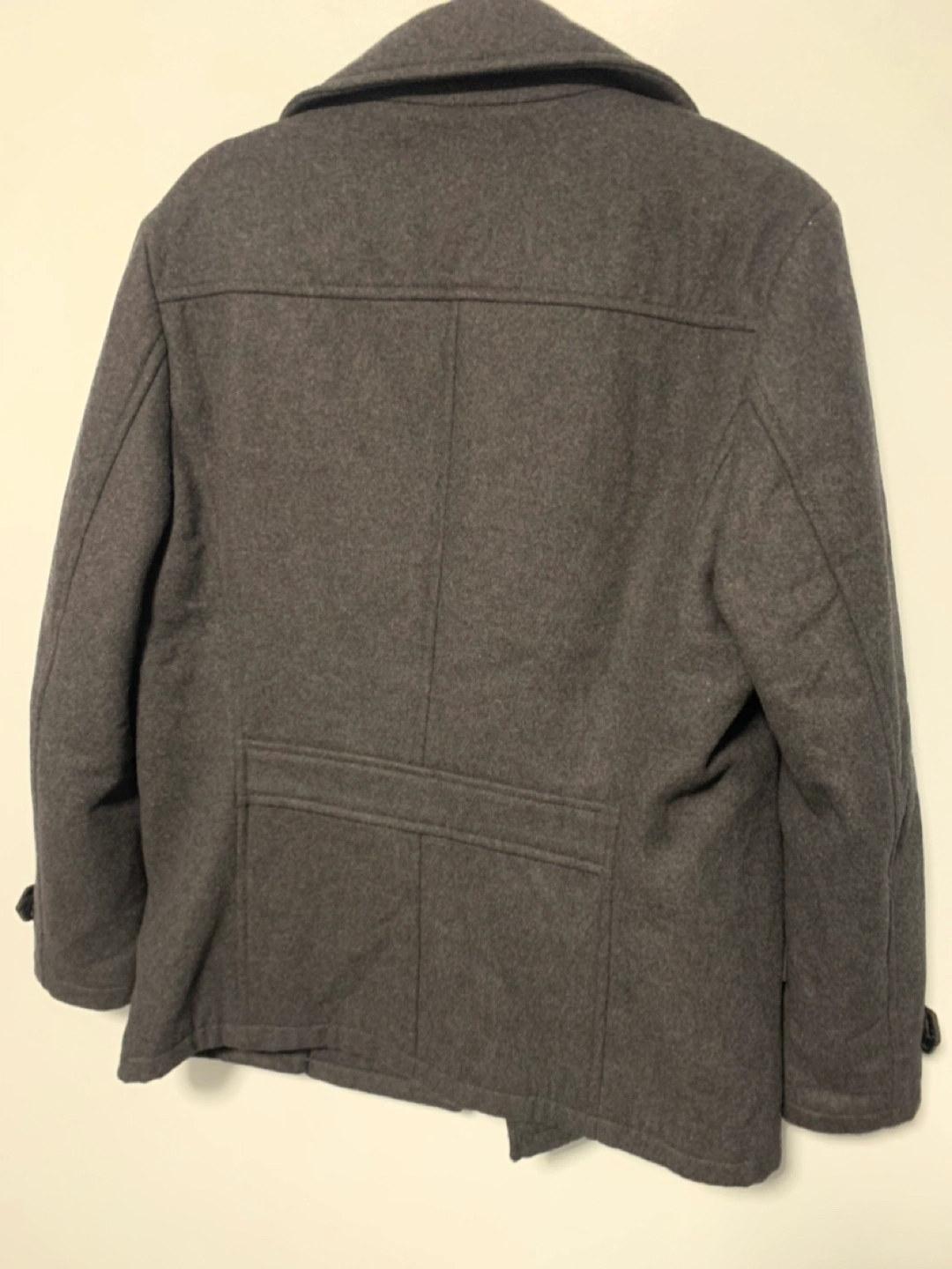 No size listed but fits like a men’s large Dark Grey double breasted peacoat Like new condition Wool with polyester lining Great quality