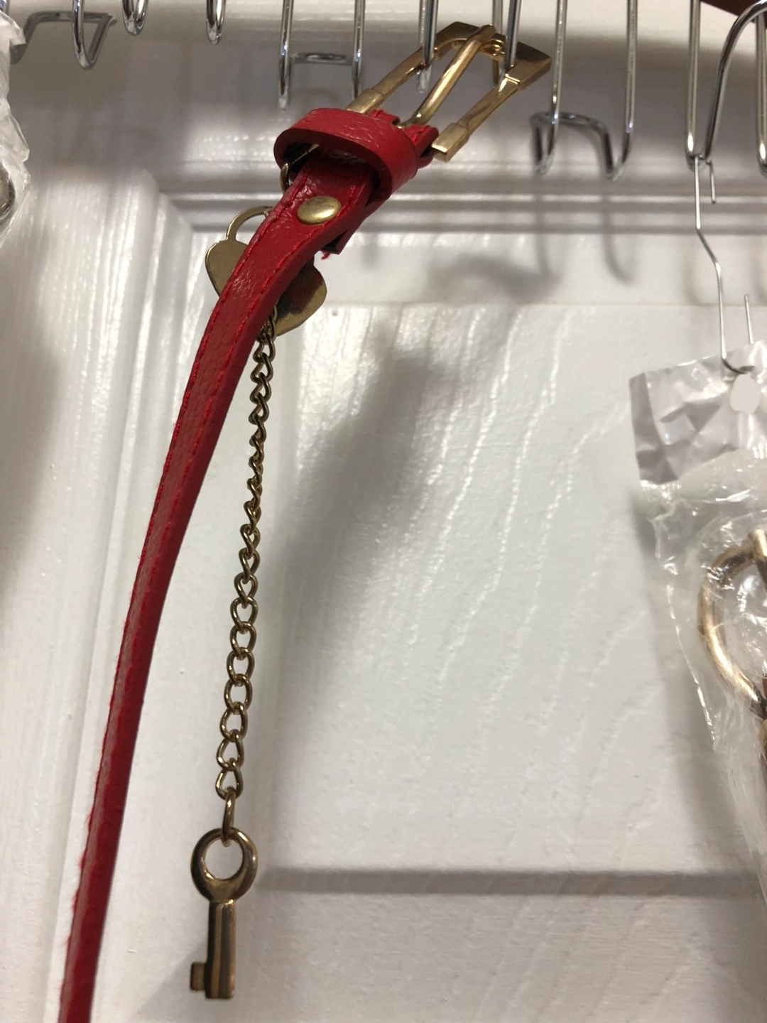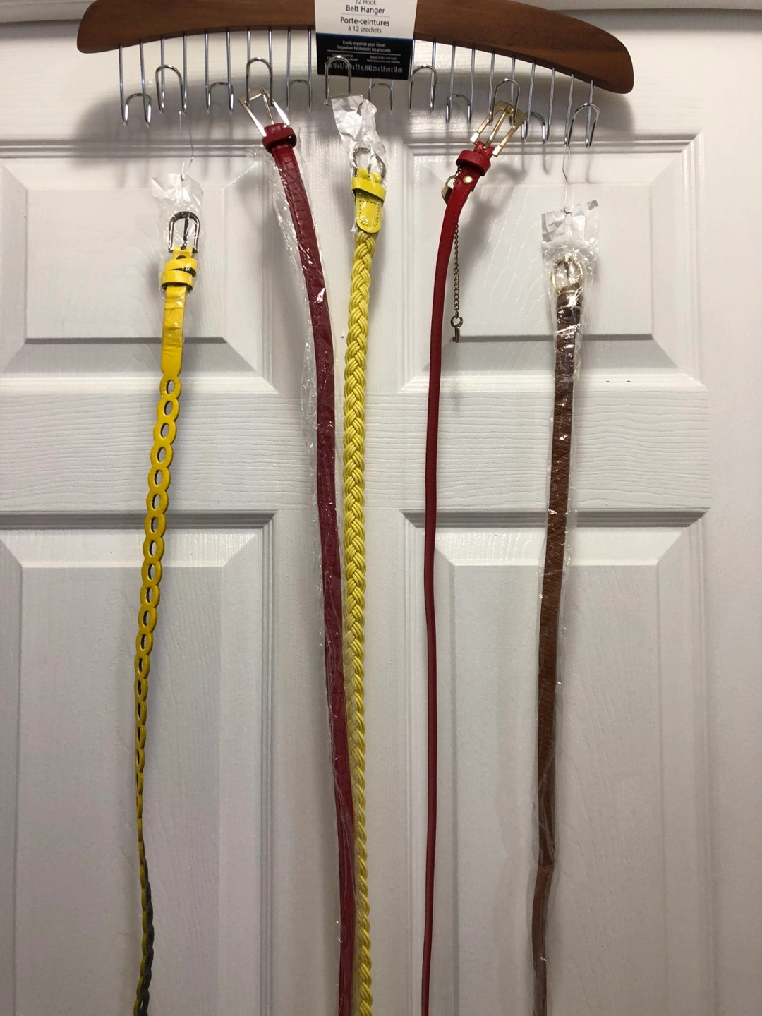 A grouping of stylish belts in various colours. Belts are still in their plastic packaging. Use these belts to complete your outfit. $ 1 each belt or $ 4 for all 5 belts