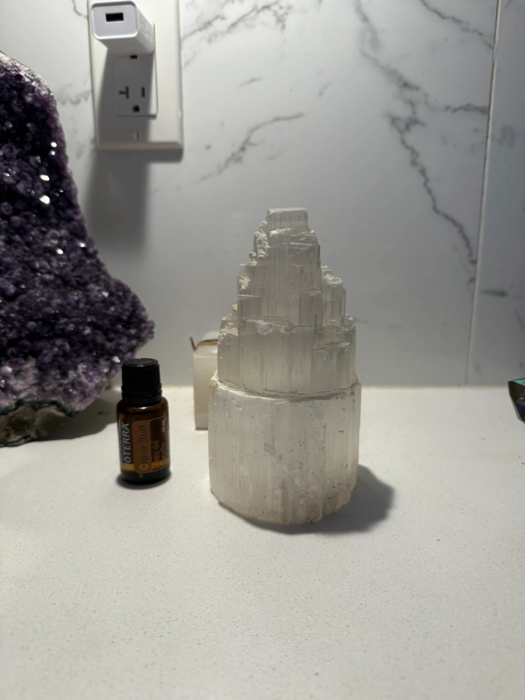 55Unique selenite tower. Perfect for any crystal collection or home decor. Adds a touch of elegance to any space. Measures approximately 6 inches tall.