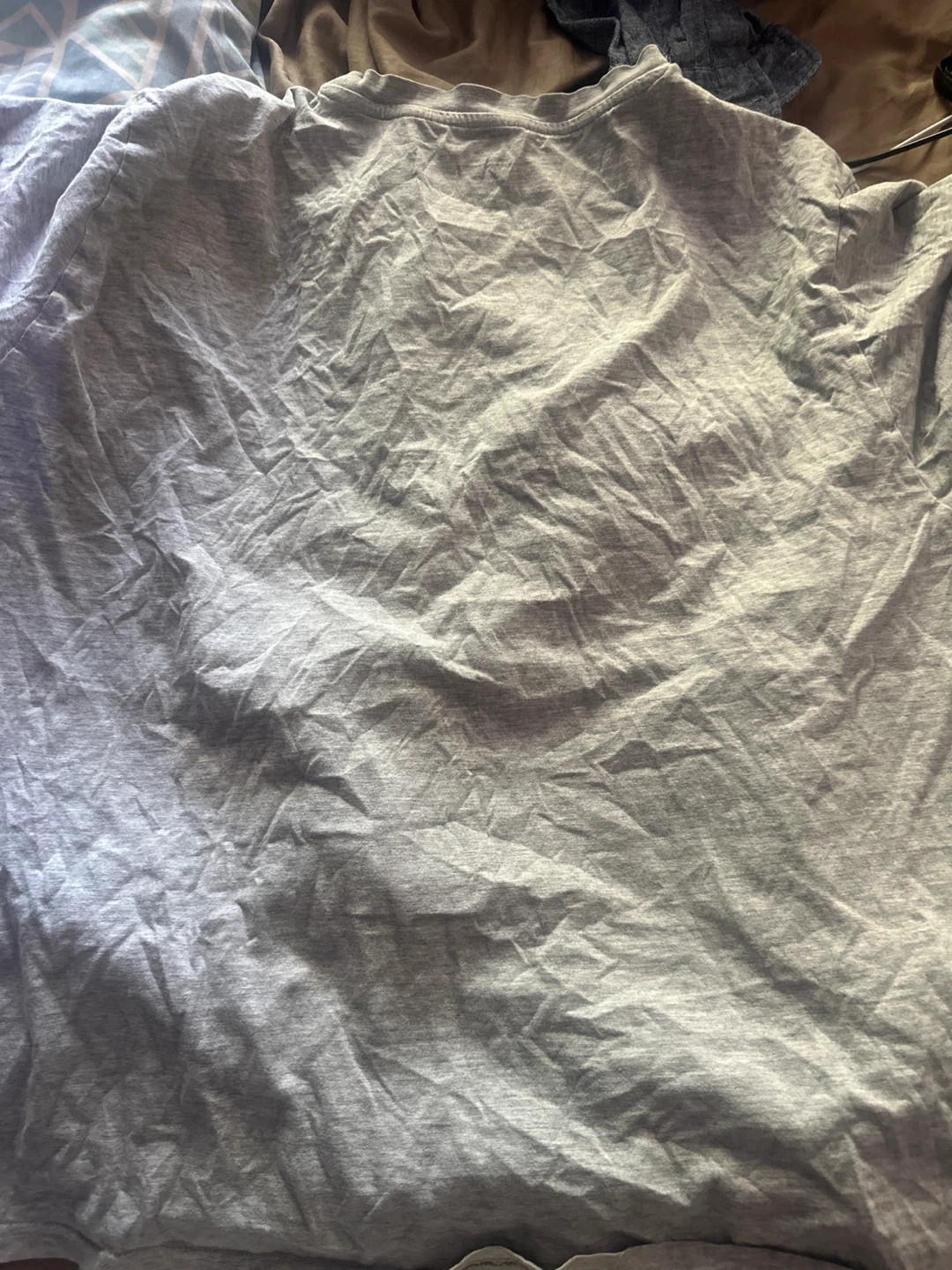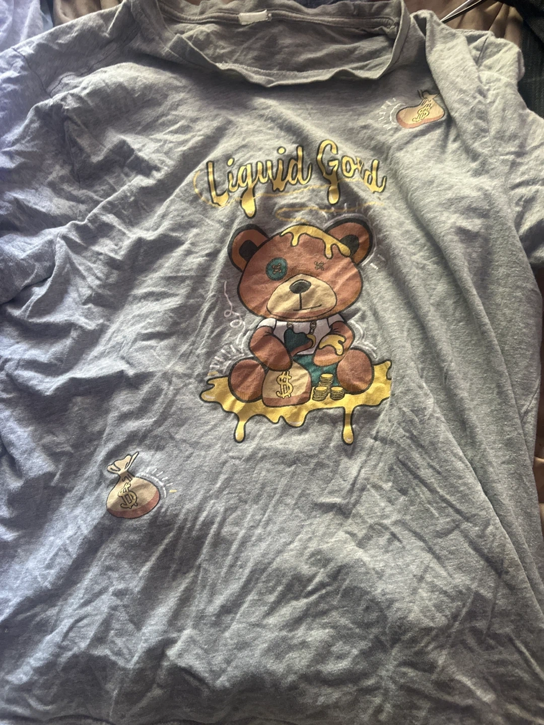 Selling a grey t-shirt with a unique graphic design featuring a teddy bear and the words "Liquid Gold" on the front. It's in good condition and ready for a new home!