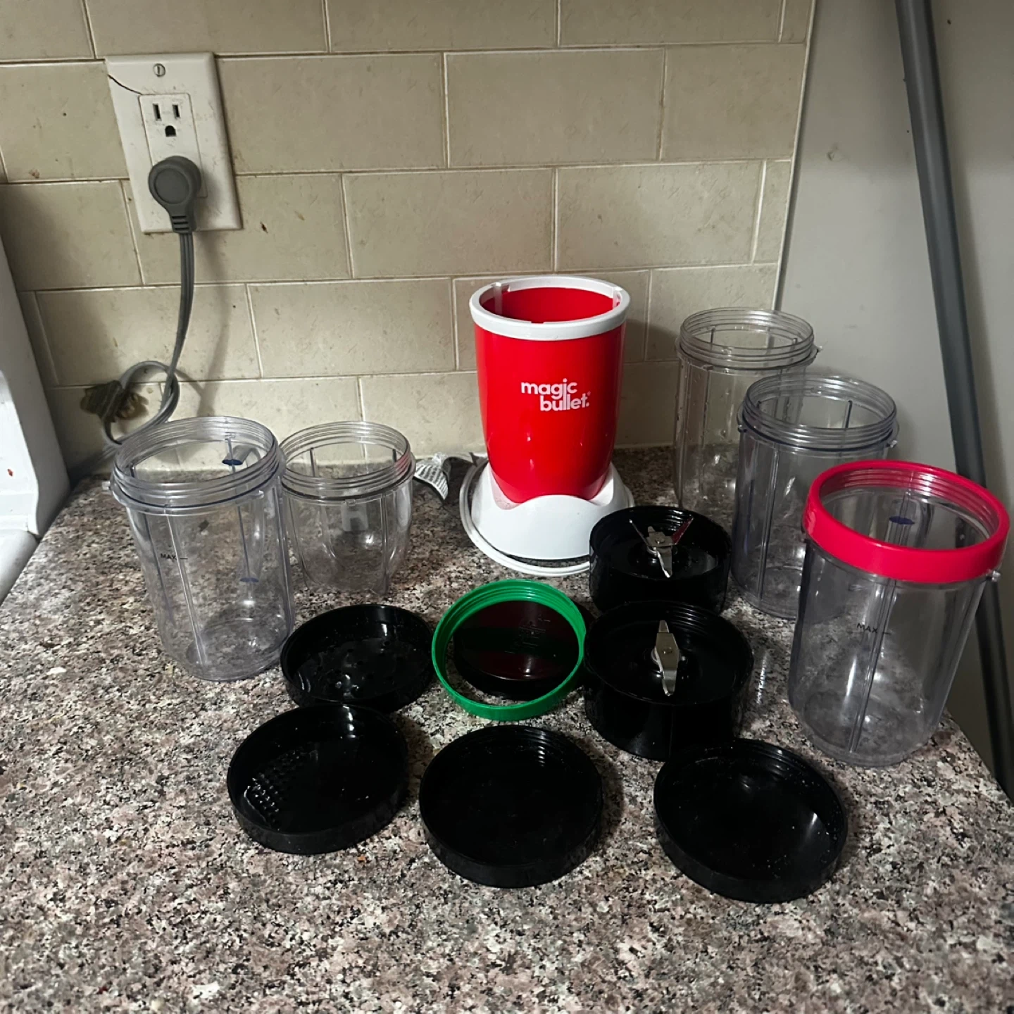10Selling a Magic Bullet blender set. Everything in the picture is included and it works perfectly! Comes with multiple cups, 2 blades, and lids.