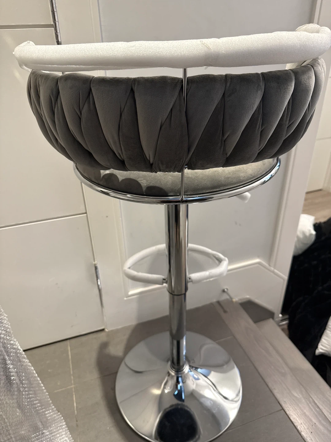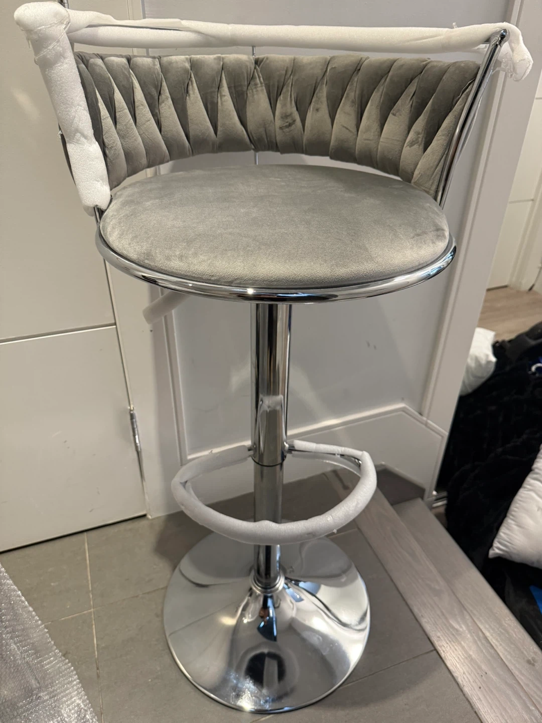 Selling a brand new bar stool, still with the protective wrapping! It features a stylish grey velvet seat and a chrome base. Perfect for adding a touch of elegance to your kitchen or bar area