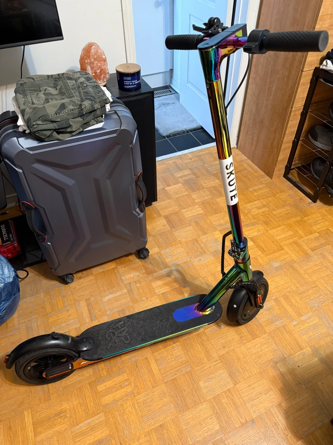 60Selling User Hyper 37V Skute Jet Fuel electric scooter, The 37 Volt Skute Jet Fuel Folding E-Scooter from Hyper is perfect for cruising around your neighborhood or downtown. Enjoy the benefits of using a scooter with assistance from the electronic motor and brake! The Skute E-Scooter has a portable folding design for easy storage at home or even in a car with a cool jet fuel paint job. Includes an LED display with speed indicator. The speed lever offers 3 speeds of 9 km/h, 14 km/h, and a maximum of 25 km/h. Complete with LED headlights and rear lights, you can even go riding around your neighborhood at night! This scooter has a maximum distance per charge of 22 kms and a max weight of 264 lbs. The 8.5-inch solid tires in the front and rear and the handle rear disc brake complete this fun e-scooter. UL certified. Hyper Bicycles has established an ongoing commitment to supporting cycling through sponsorships of individuals and teams, and it has maintained its position as a leader in the industry, producing the highest quality parts that perform as well as they look.