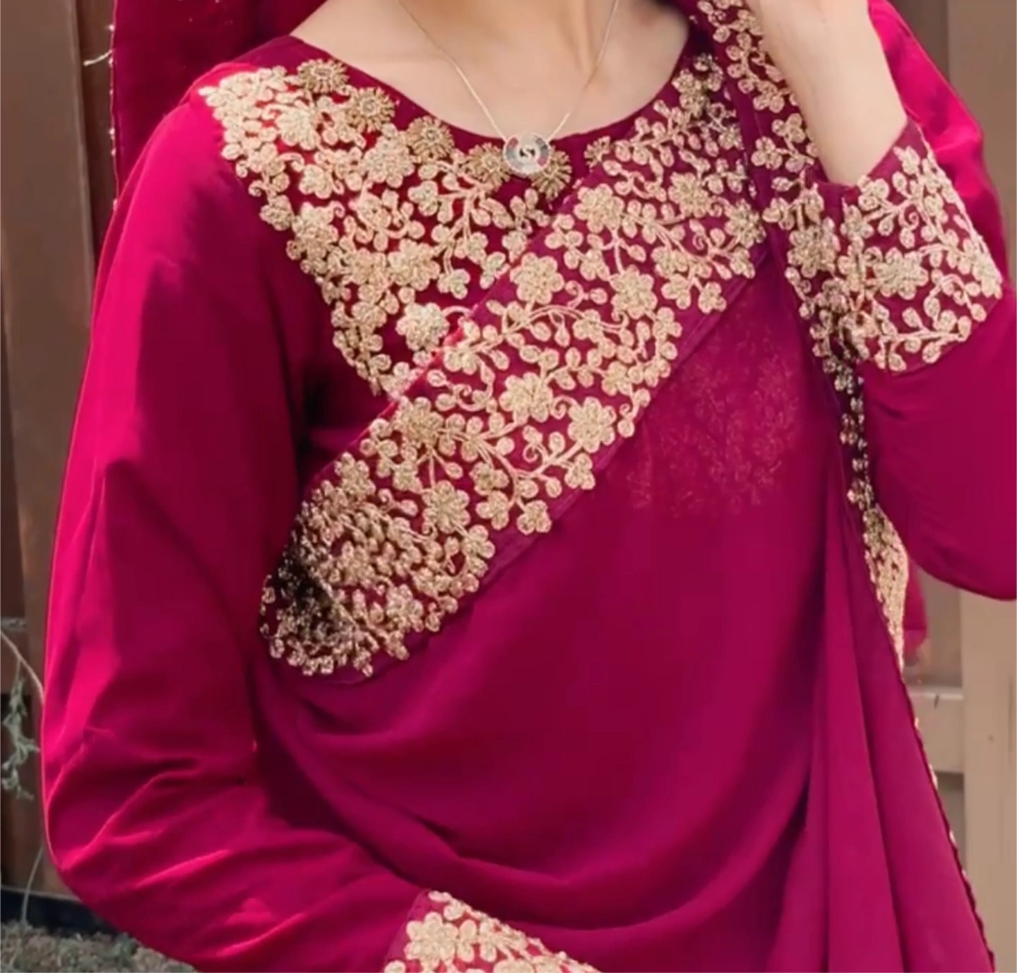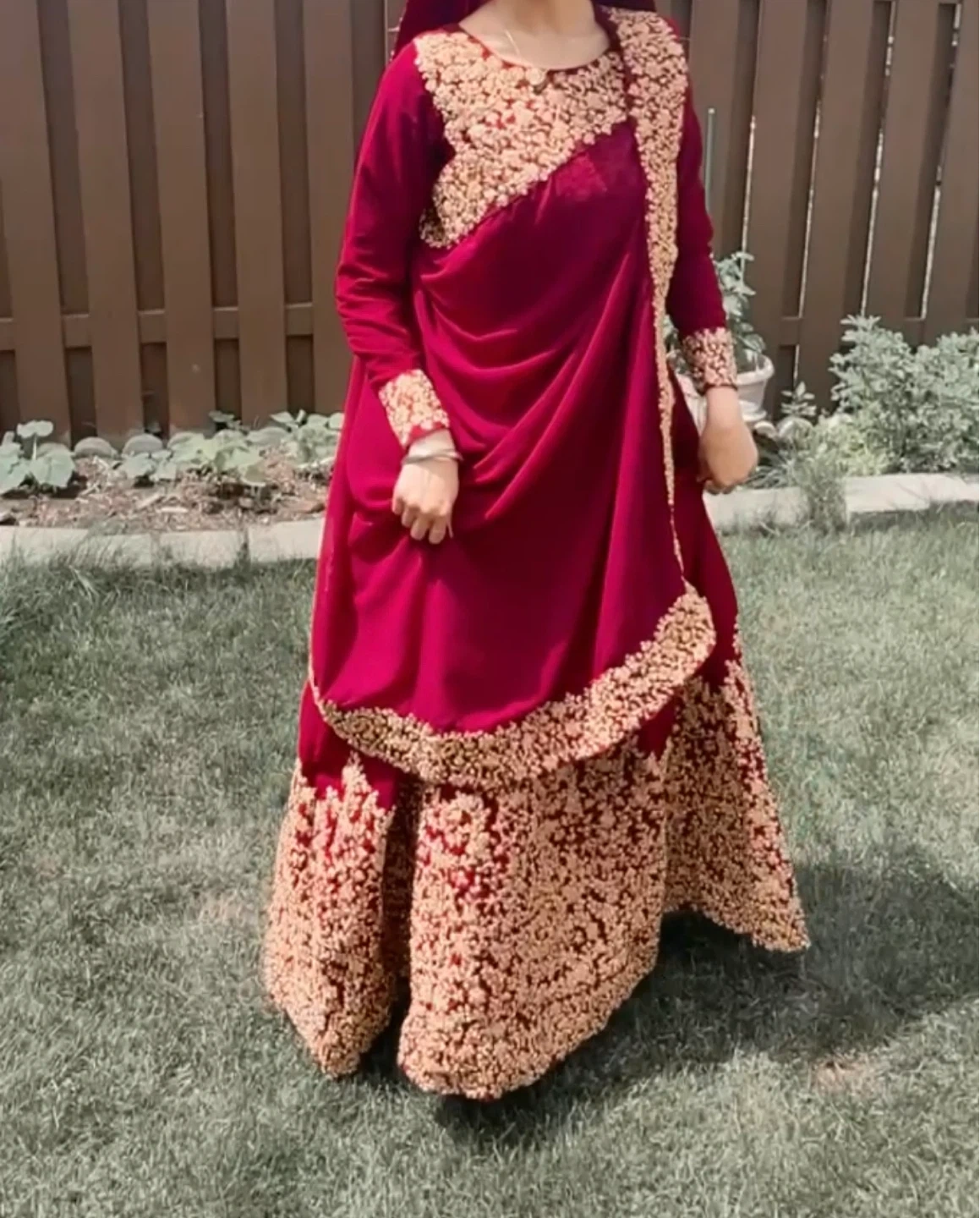 20Selling out this beautiful light weight one piece dress with embroidery on the dress & dupatta too. Its colour is wine and with golden embroidery. Just been wore for once and for the size you can dm me.
