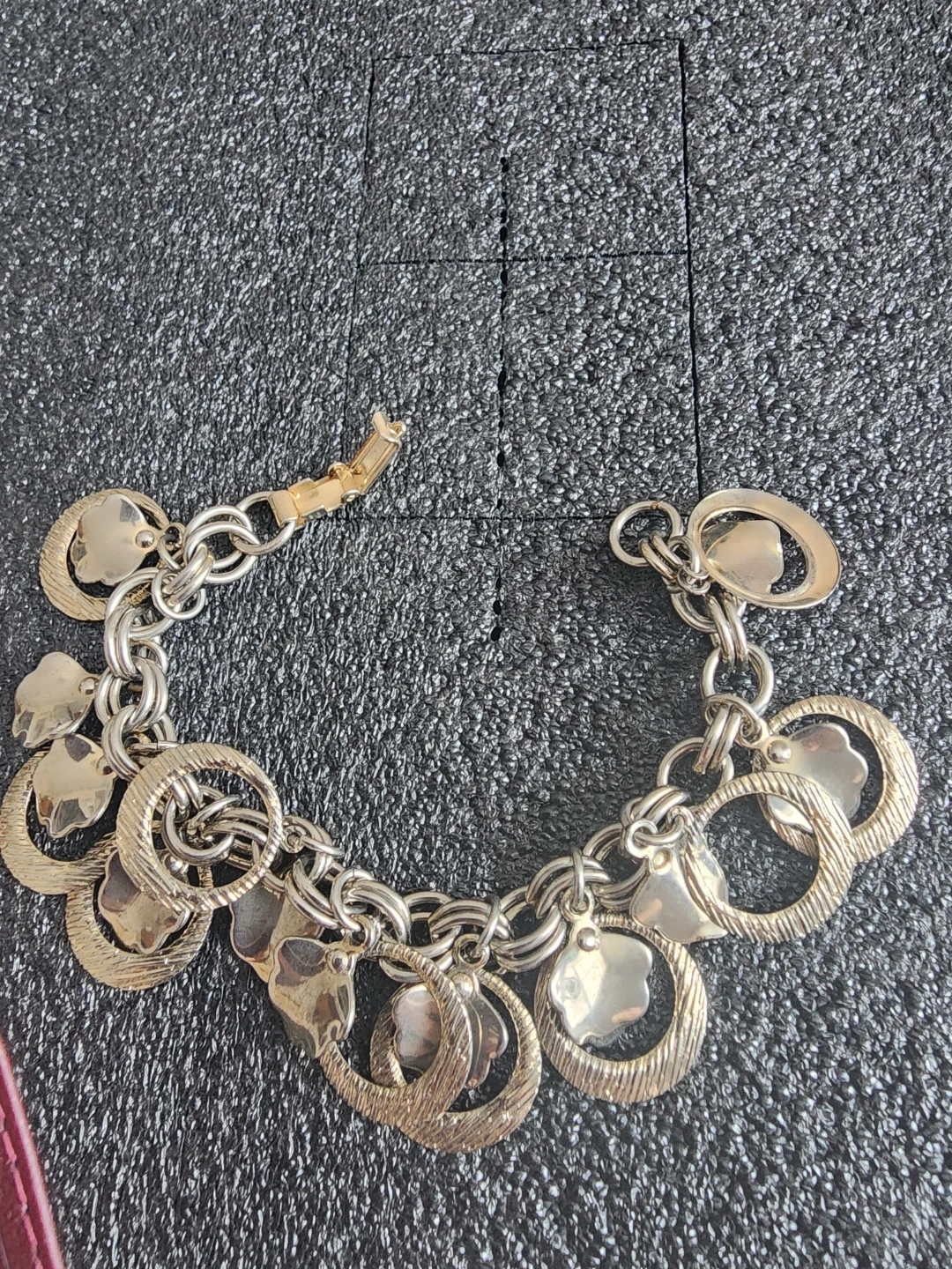 This charm bracelet features a silver-tone chain with a gold-tone clasp. It's adorned with various charms, including clover shapes and textured rings. A classic accessory for any occasion!