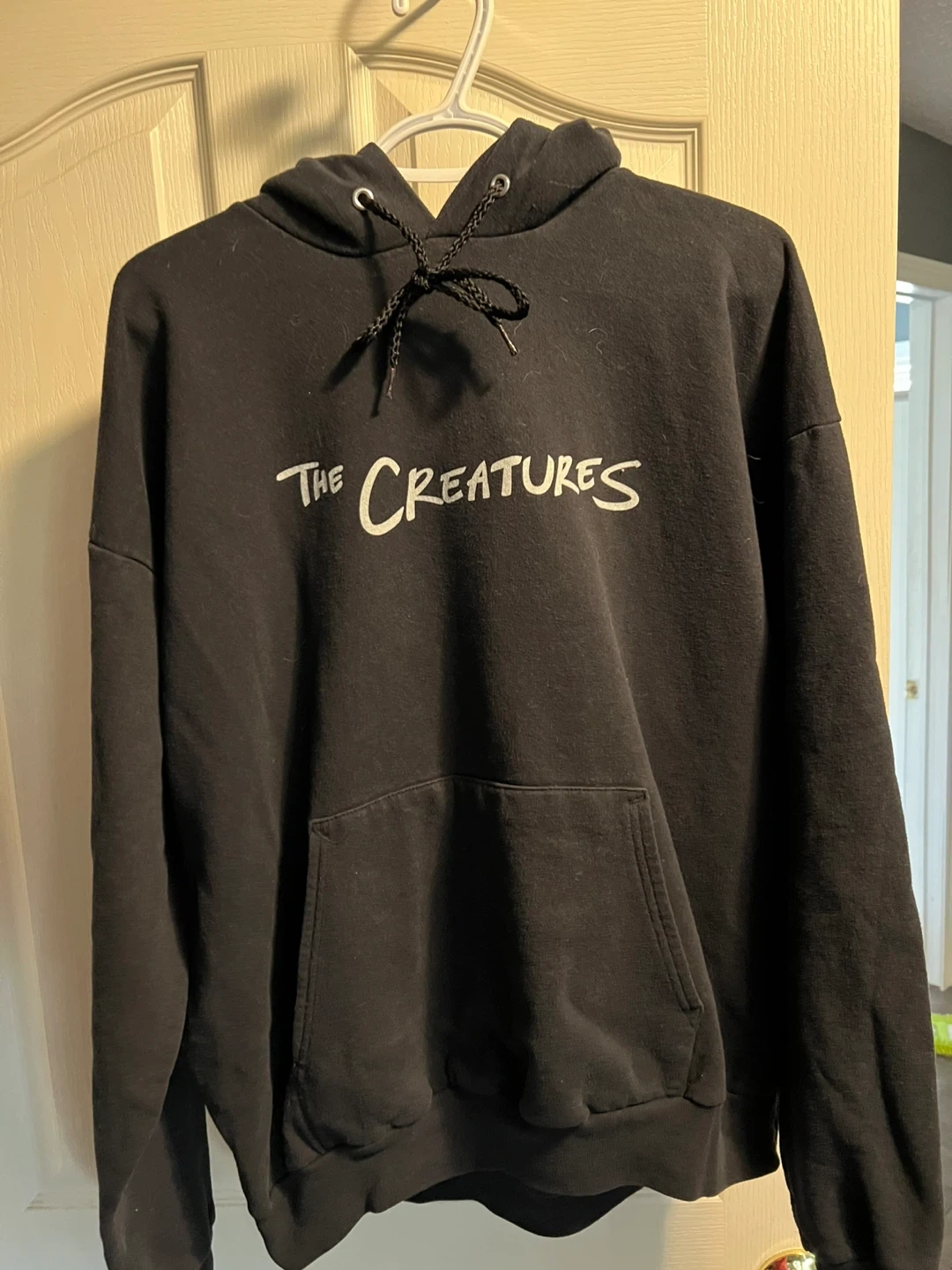 Black hoodie with "The Creatures" printed on the front. It's a pullover style with a front pouch pocket and adjustable drawstring hood. Made of a soft, comfortable material. xl
